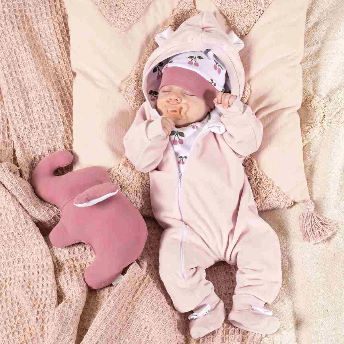 Praktické detaily, ako sú ohrnovacie rukáviky a kapucňa s roztomilými uškami, z nej robia ideálnu voľbu na každodenné prechádzky aj cestovanie v kočíku. Materiál si dlhodobo udržiava svoj tvar a vzhľad, takže kombinéza vyzerá skvele aj po opakovanom praní.