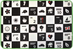 Kontrastná čierno‑biela šachovnica s číslami a bodkami na prvé počítanie + farebná abeceda so zvieratkami na hravé učenie písmen.
