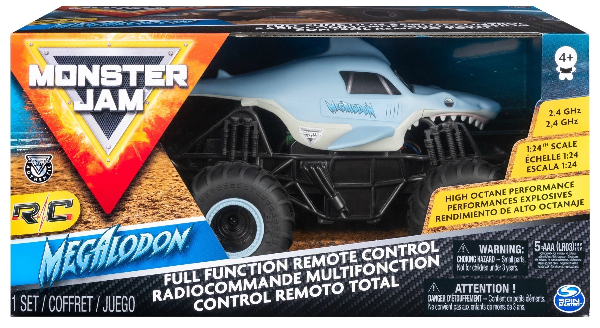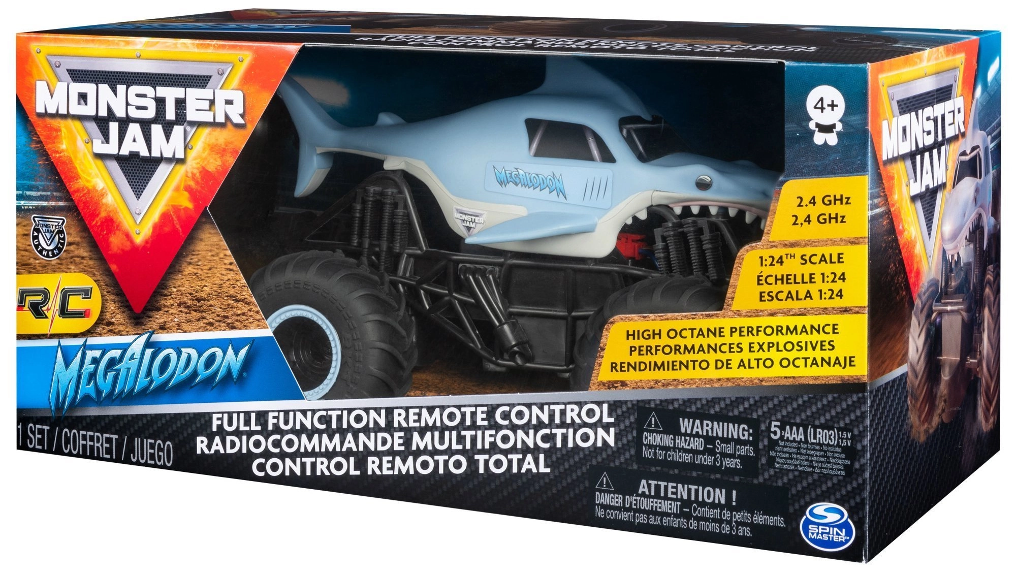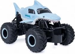 Licencované RC auto MONSTER JAM Megalodon prináša autentický vzhľad ikonického monster trucku s modrou karosériou v štýle žraloka, plutvami a zubami. Mierka 1:24 je ideálna na domáce preteky a prvé RC zážitky.