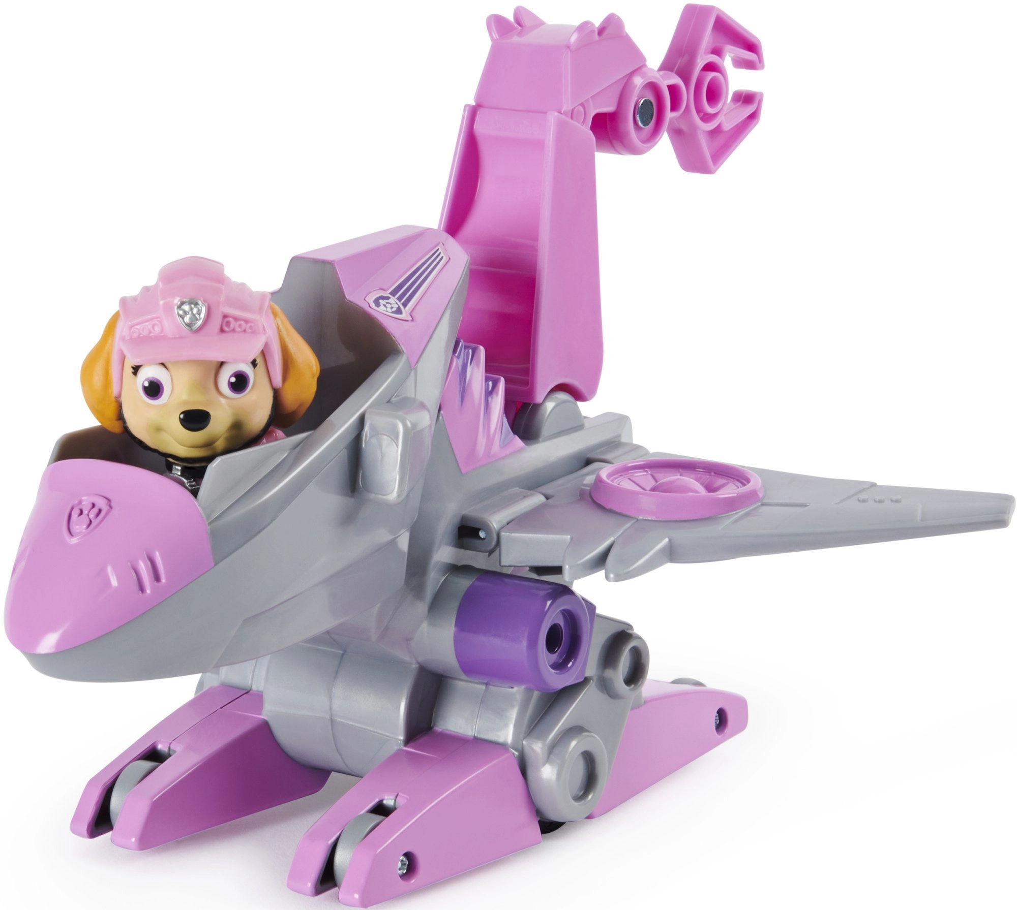 Figúrka Skye je detailne spracovaná, nosí ružovú čiapku a jetpack, má pohyblivé prvky pre jednoduché pózovanie a hranie. Vozidlo je prispôsobené pre figúrku, takže deti môžu ihneď vyraziť na dino záchranné misie.