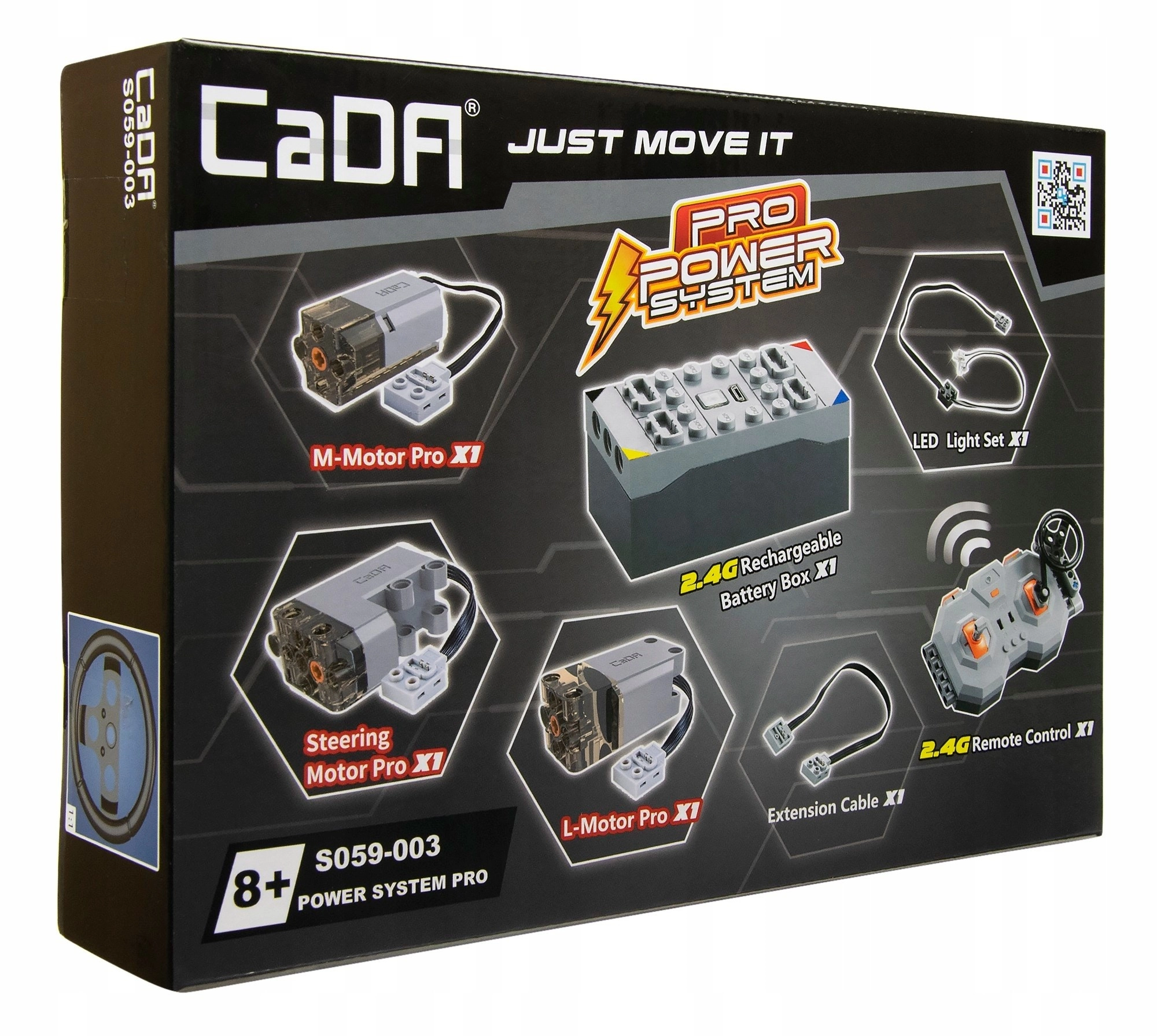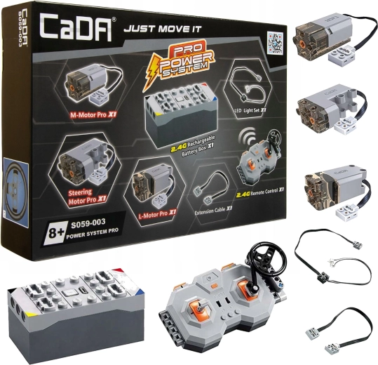 Sada Pro Power System dodá vašim stavebniciam CaDA skutočný pohon a ovládateľnosť. Vďaka kombinácii motorov, servo riadenia, akumulátora a 2,4 GHz diaľkového ovládača môžete jazdiť dopredu aj dozadu, zatáčať, zapínať/vypínať LED svetlá a pri vybraných modeloch tiež otvárať či zatvárať dvere. Ideálne pre staviteľov, ktorí chcú premeniť statické modely na plne funkčné RC vozidlá.
