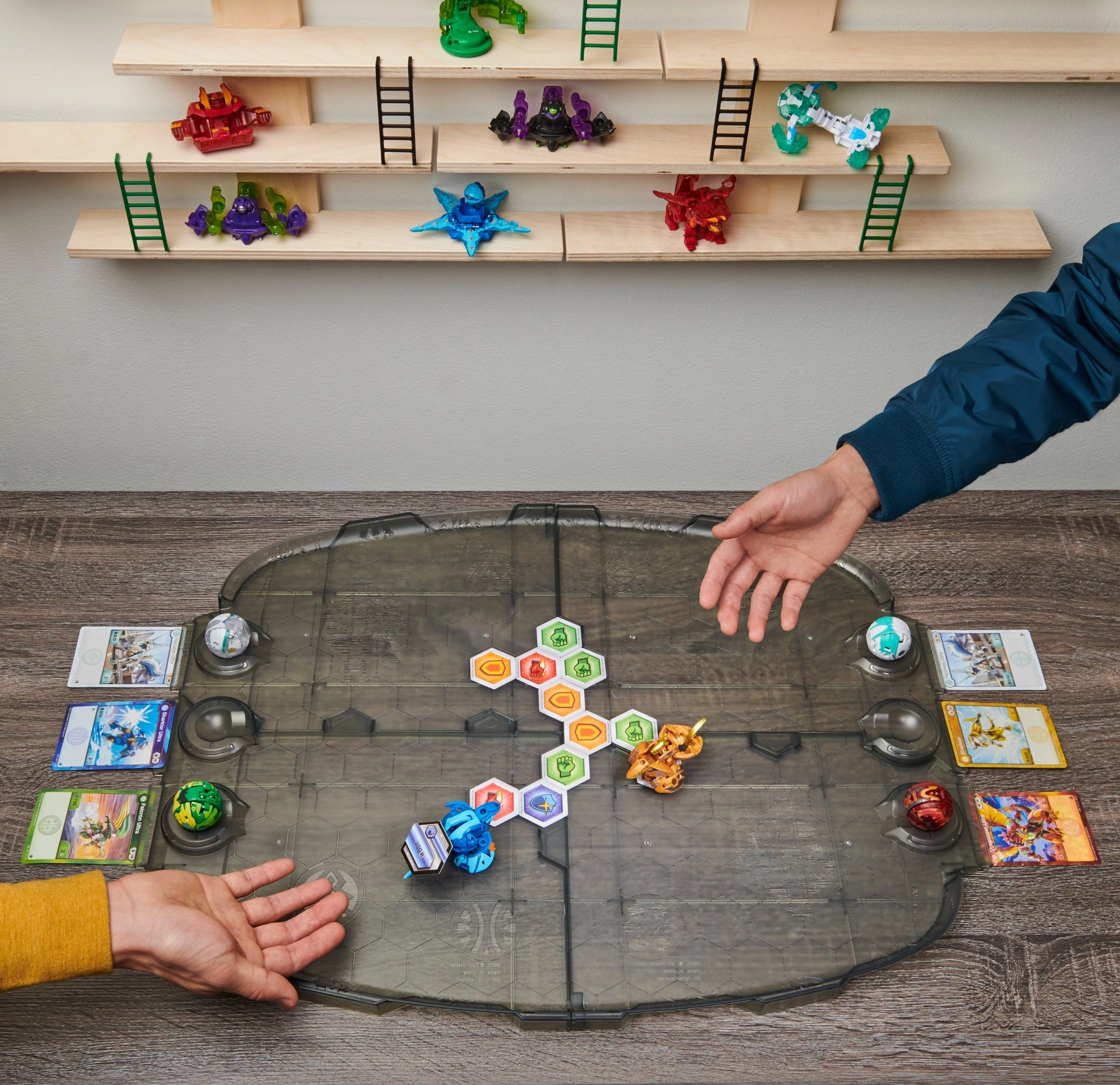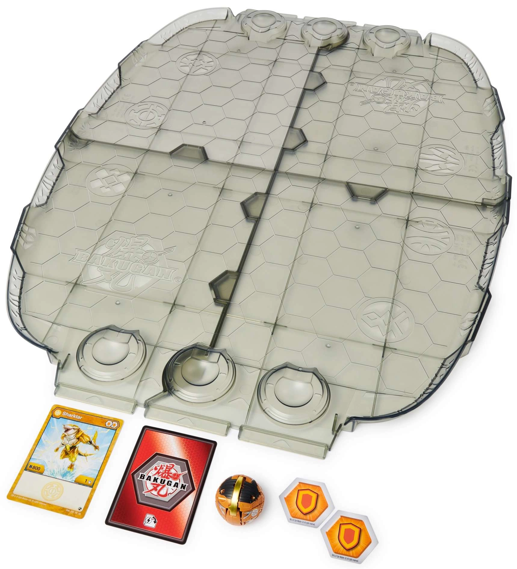 Robustné, skladacie pole so zvýšenými okrajmi udrží Bakužetóny aj figúrky na mieste. Šesťuholníkový vzor uľahčuje rýchlu prípravu hry a prehľadné súboje.