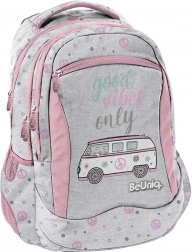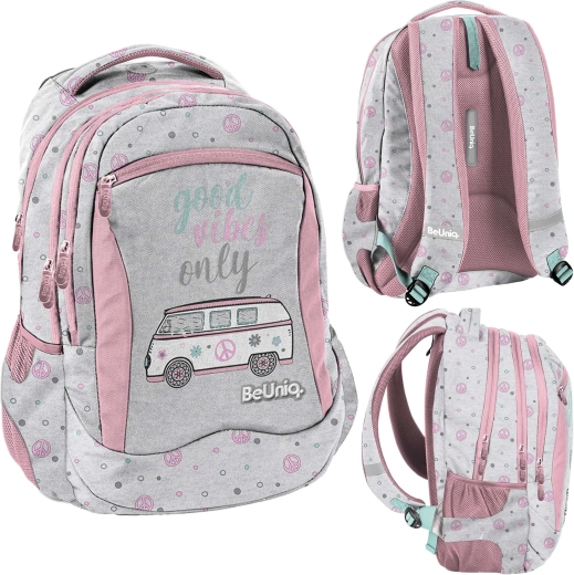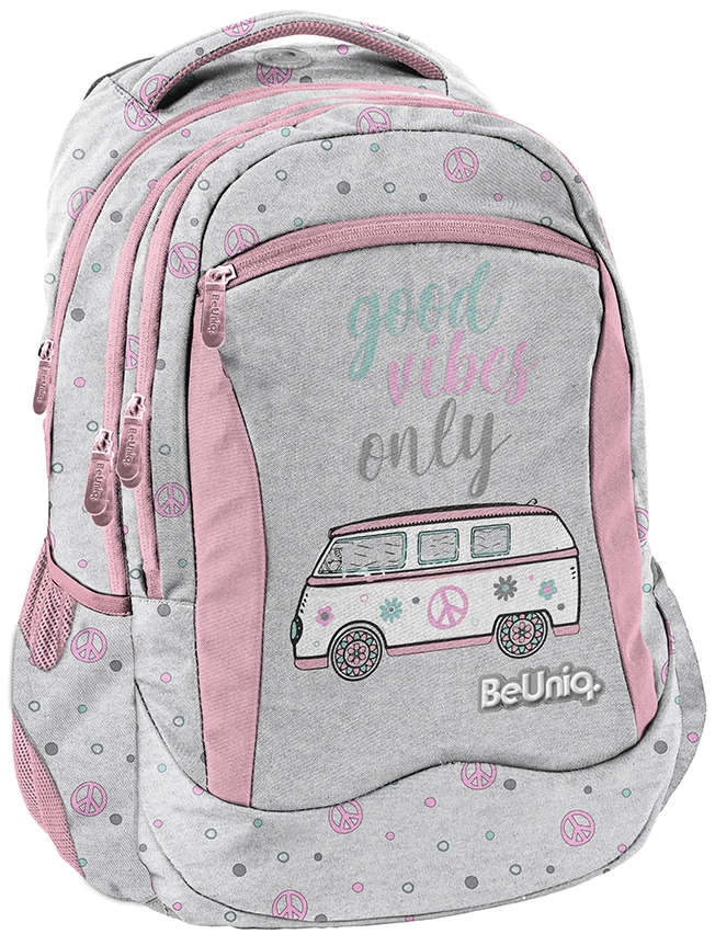 Hľadáte spoľahlivý školský batoh, ktorý zvládne každodennú prevádzku a zároveň skvele vyzerá? BeUniq Good Vibes Only v kombinácii svetlosivej a ružovej s hravými motívmi a nápisom „good vibes only“ zaujme na prvý pohľad. Vďaka premyslenej organizácii vecí a komfortnému chrbtovému systému je ideálny do školy aj na voľný čas.