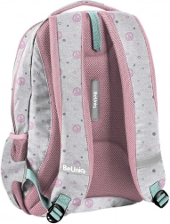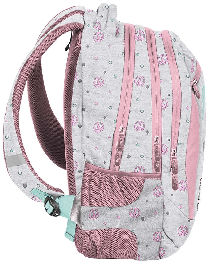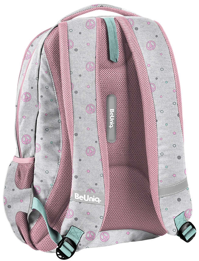 Štýlový školský batoh BeUniq Good Vibes Only od značky Paso v sivo‑ružovom prevedení ponúka 3 priestranné komory, predné vrecko na zips a bočné sieťky na fľašu. Má polstrovaný ergonomický chrbát, pohodlné nastaviteľné popruhy, priedušný chrbtový panel a reflexné prvky pre bezpečnosť. Odolný materiál a kvalitné zipsy zaisťujú dlhú životnosť aj každodenné pohodlie.