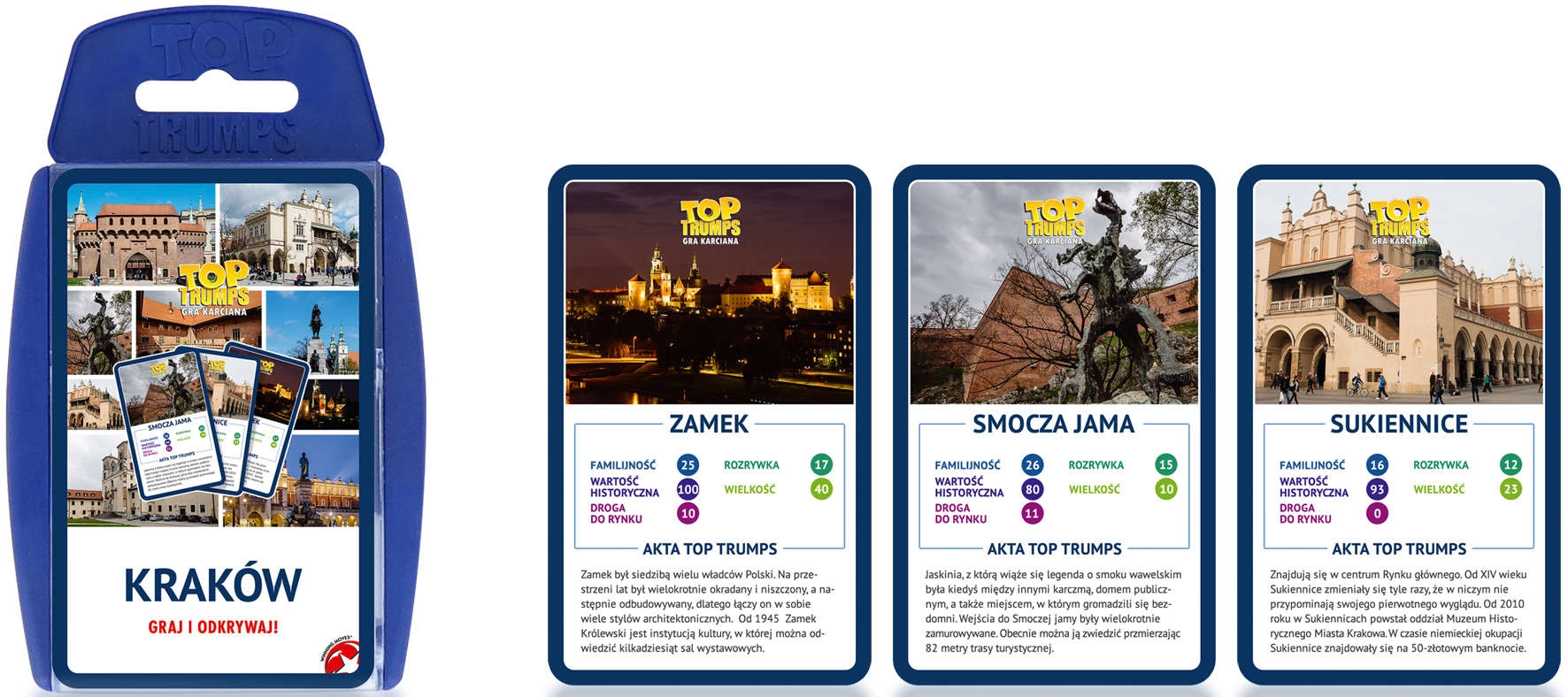 Edícia Krakov prináša tematické karty s lokalitami a zaujímavosťami, ktoré hre dodávajú charakter. Vďaka praktickému plastovému puzdru si hru vezmete kamkoľvek – na výlet, dovolenku aj návštevy.