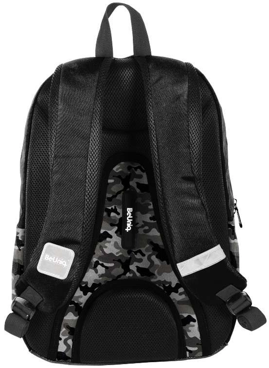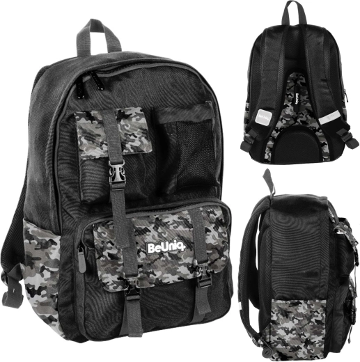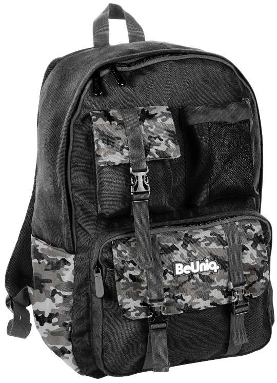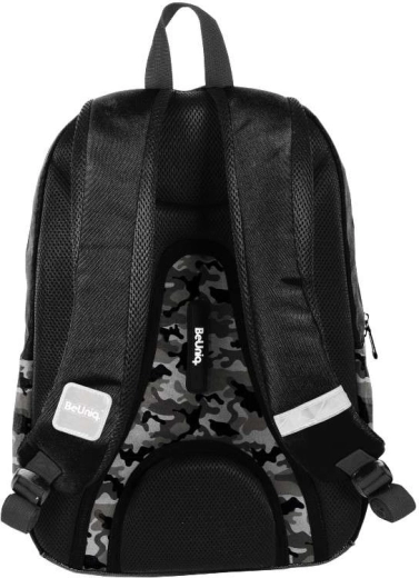 Hľadáte spoľahlivý školský batoh na každý deň? BeUniq Moro kombinuje moderný maskáčový dizajn a funkčnosť: jednu veľkú komoru na učebnice a zošity A4, tri predné vrecká na zips pre drobnosti a dve bočné materiálové vrecká na fľašu. Vystužený, anatomicky tvarovaný chrbát s priedušnou sieťovinou a pohodlné ramenné popruhy s reguláciou zaistia komfort aj pri plnom zaťažení.