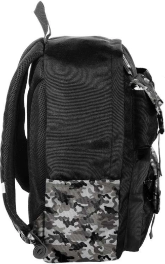 Ľahký školský batoh BeUniq Moro od značky Paso v čiernej farbe s maskáčovým vzorom ponúka priestrannú hlavnú komoru, pohodlné ergonomické popruhy a pevne vystužený, priedušný chrbát. Vďaka reflexným prvkom je bezpečný na ceste do školy, bočné vrecká na fľašu a predné vrecká na zips sa postarajú o perfektnú organizáciu. Vyrobený z odolného, nepremokavého polyesteru a vhodný pre formát A4.