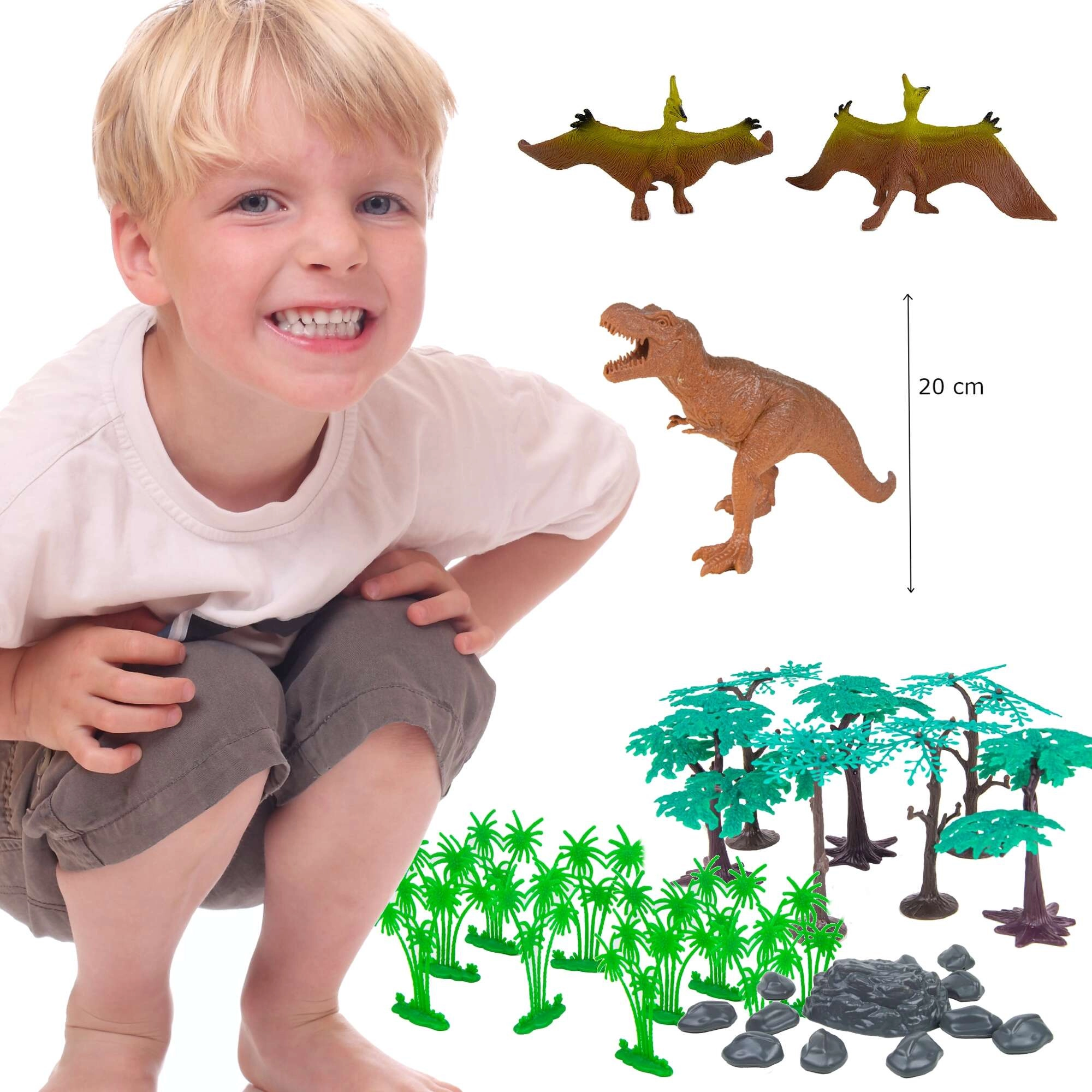 Štyri veľké figúrky (vrátane T‑Rexa a pterosaura), sedem stredných, šestnásť malých a k tomu stromy i skaly. Postavte si vlastnú pravekú krajinu a rozprávajte príbehy.