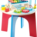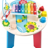 Stôl obsahuje xylofón, korálkové bludisko, hru s ozubenými kolieskami a labyrint, ktoré podporujú hudobný a motorický rozvoj.