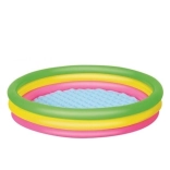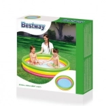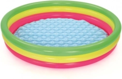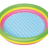 Dúhový kruhový bazénik z odolného vinylu prináša pohodlie aj istotu pri detských vodných radovánkach. Mäkké, nafukovacie a textúrované dno tlmí došľapy a izoluje od chladu zeme, takže je skvelý ako na trávnik, tak na terasu. Tri samostatne nafukované prstence držia tvar a zvyšujú stabilitu konštrukcie.