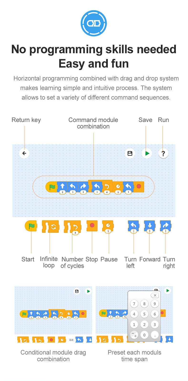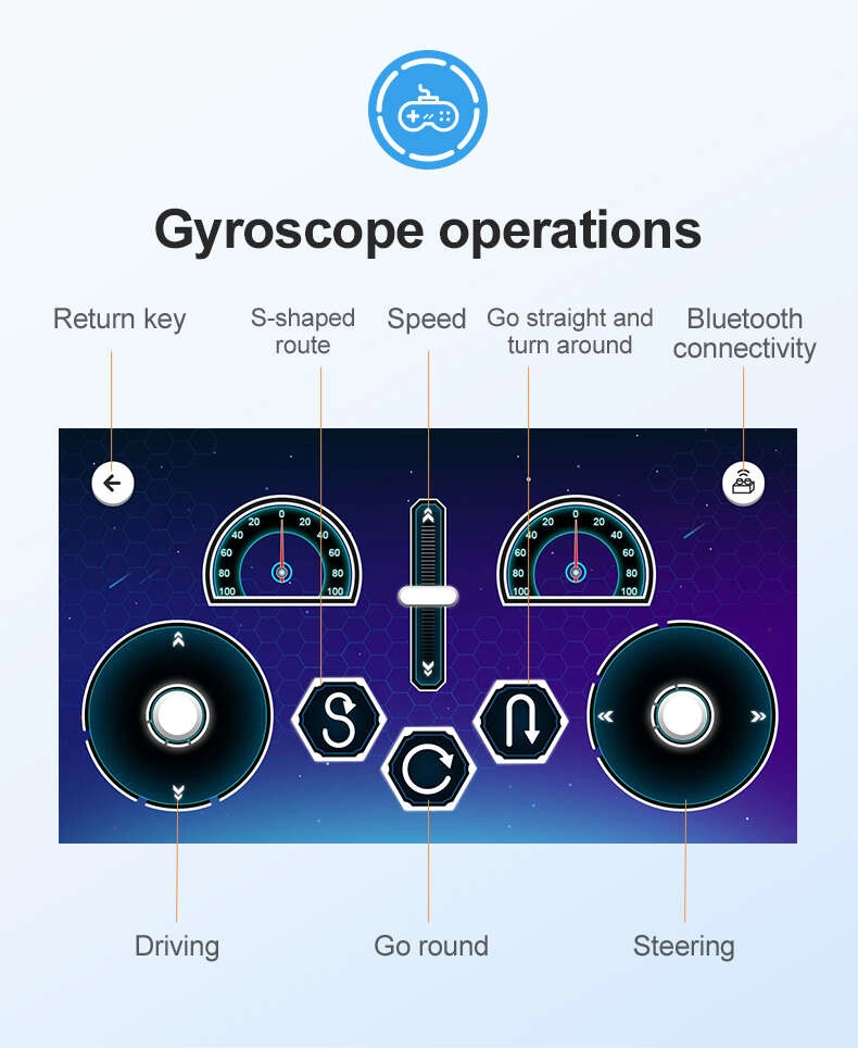 - Diaľkové ovládanie, Scratch programovanie, Gyroskopické ovládanie, Režim trasy