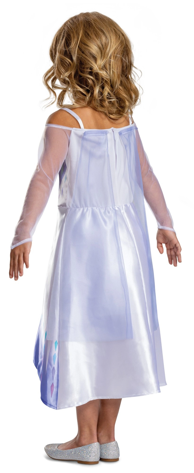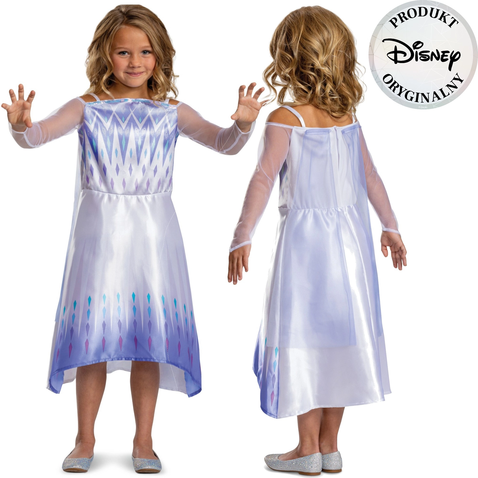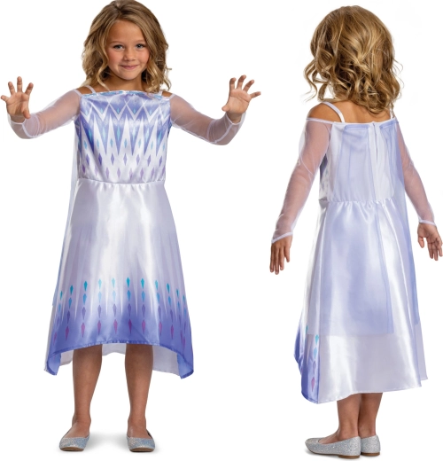 Premeňte každodenné hranie na ľadové kráľovstvo s kostýmom inšpirovaným hrdinkou ELSA z filmu DISNEY FROZEN. Šaty v jemných tónoch bielej, lila a striebornej majú priesvitné rukávy, potlačený živôtik s „ľadovými“ motívmi a splývavú sukňu s plynulým prechodom farieb a drobnými diamantovými vzormi.