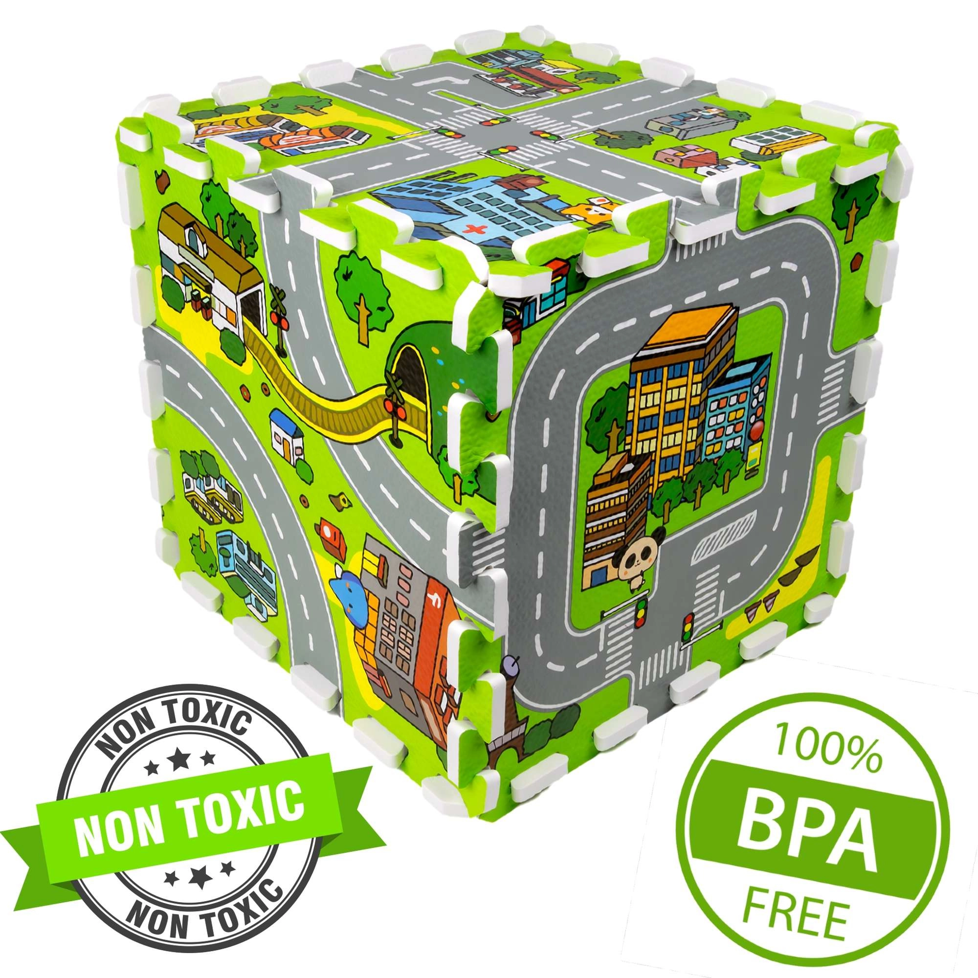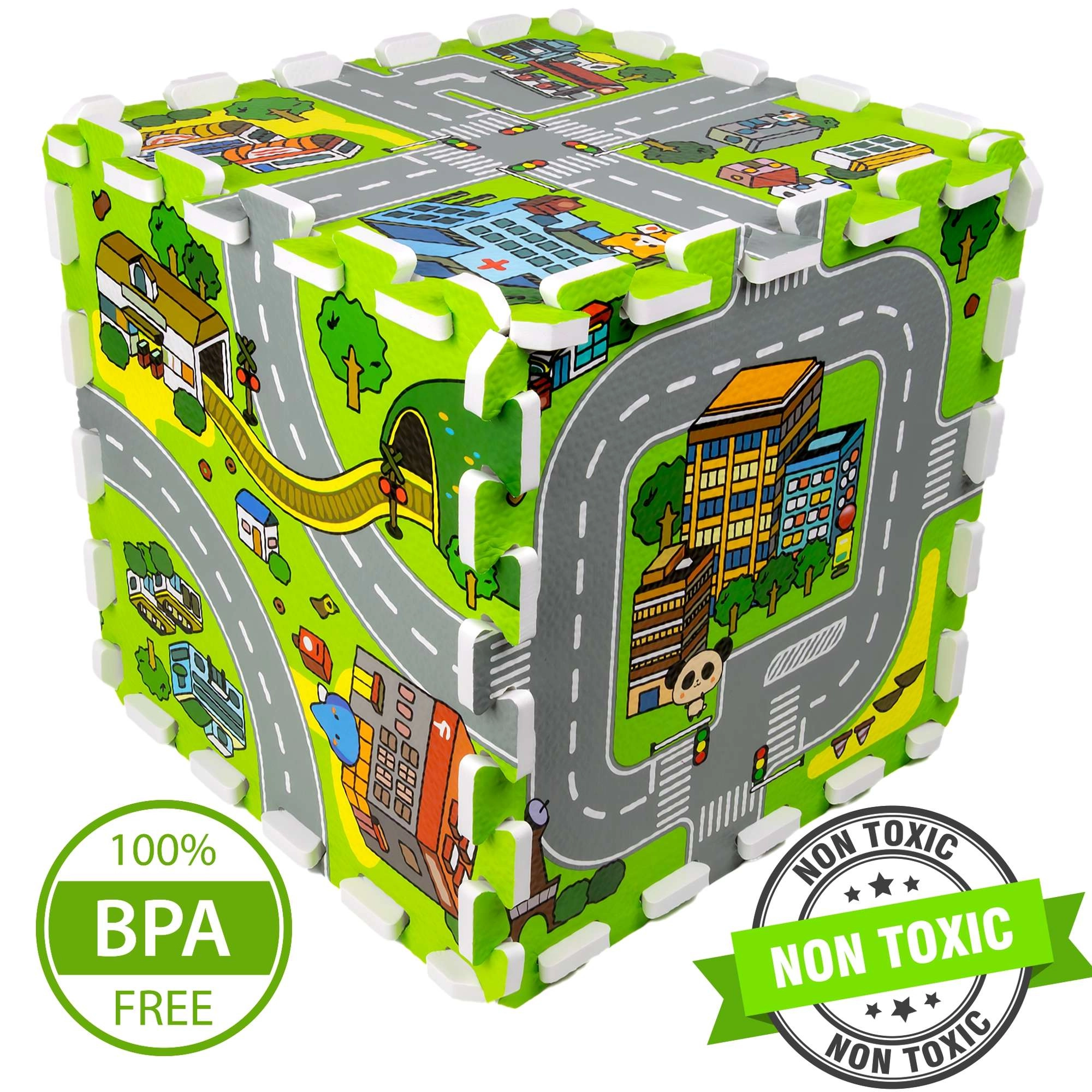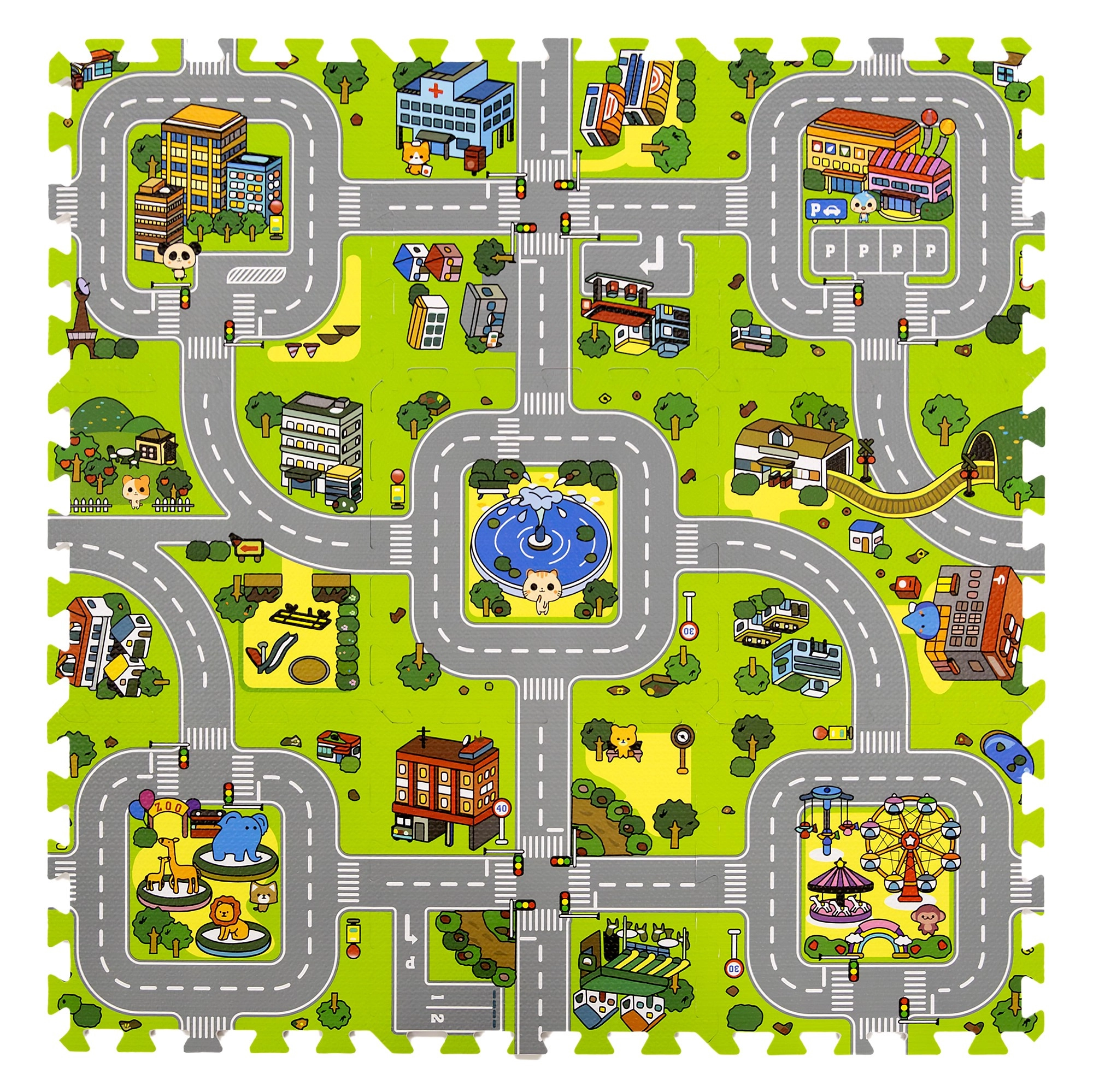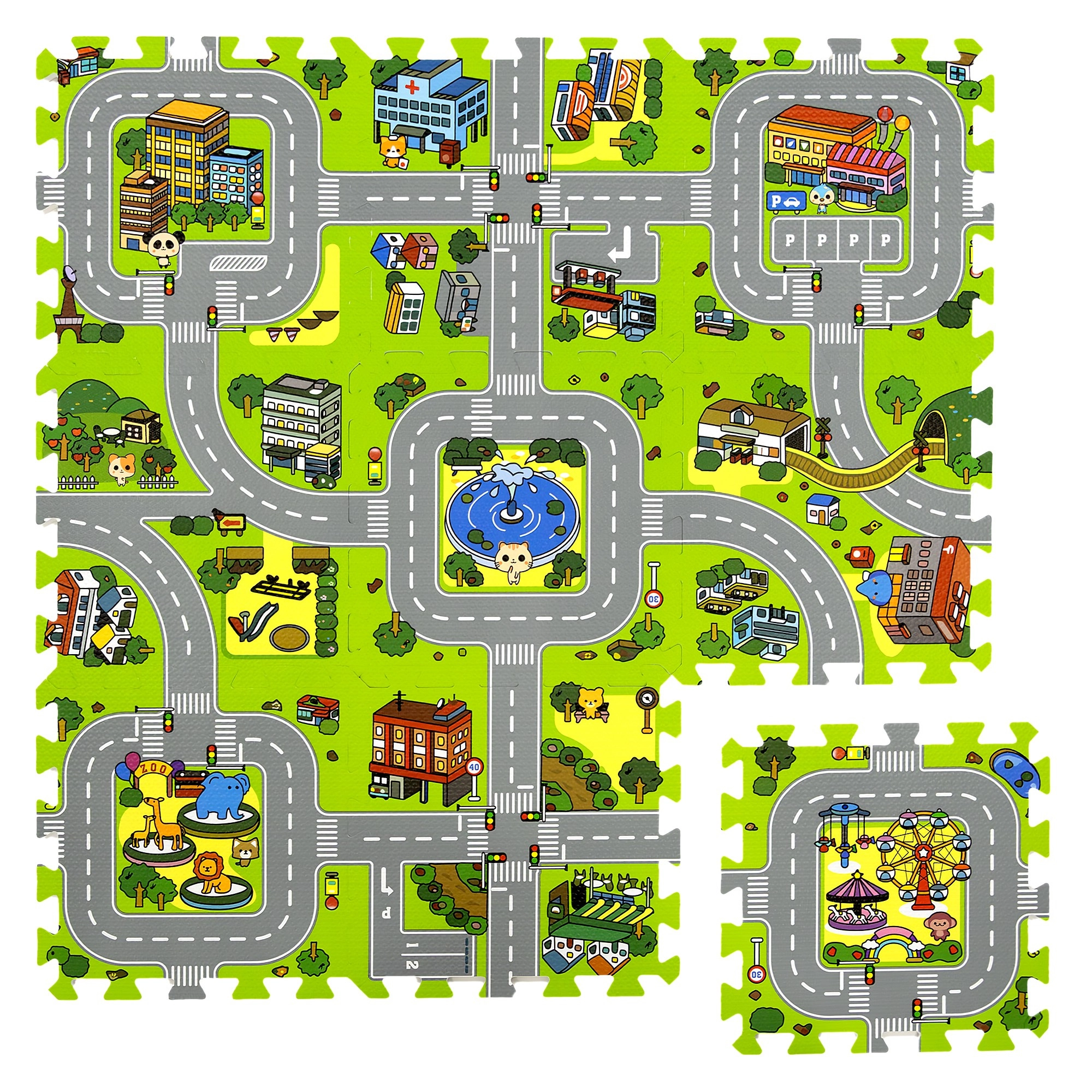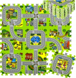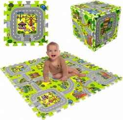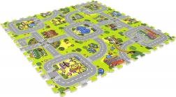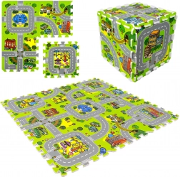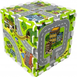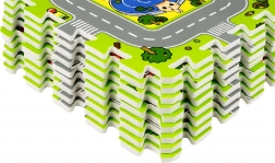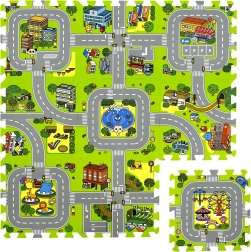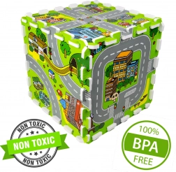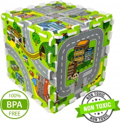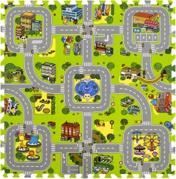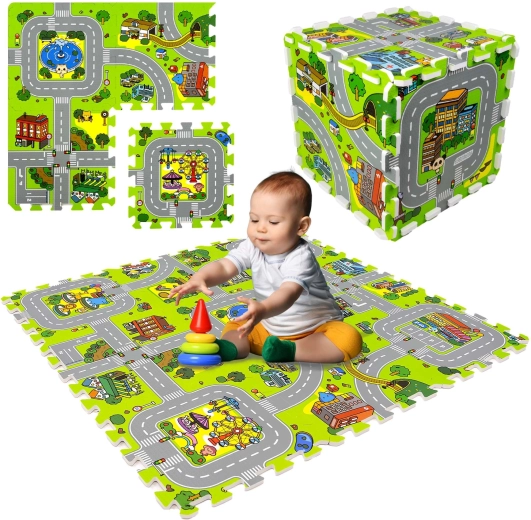 Mäkká penová podložka z EVA s rozmermi 90 × 90 × 1 cm, tvorená 9 dielmi s motívom mesta a ciest, poskytne deťom bezpečné a pohodlné miesto na hranie aj prvé krôčiky. Diely sa dajú ľahko skladať, rozširovať a tvoriť aj 3D tvary. Podložka je vodoodolná, protišmyková, tlmí nárazy a izoluje od chladu podlahy.