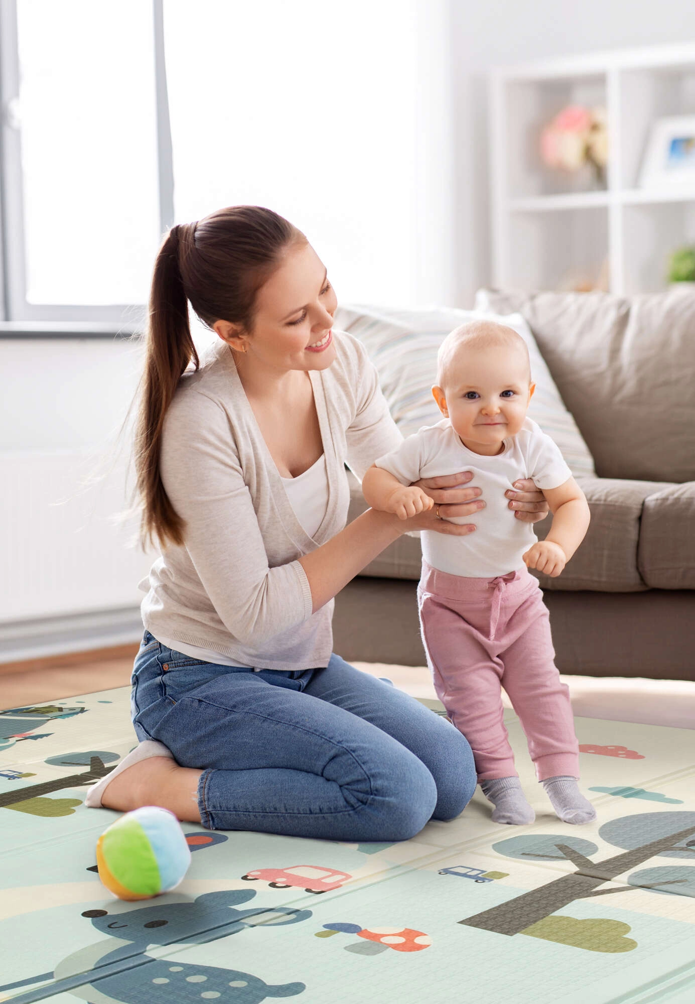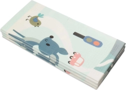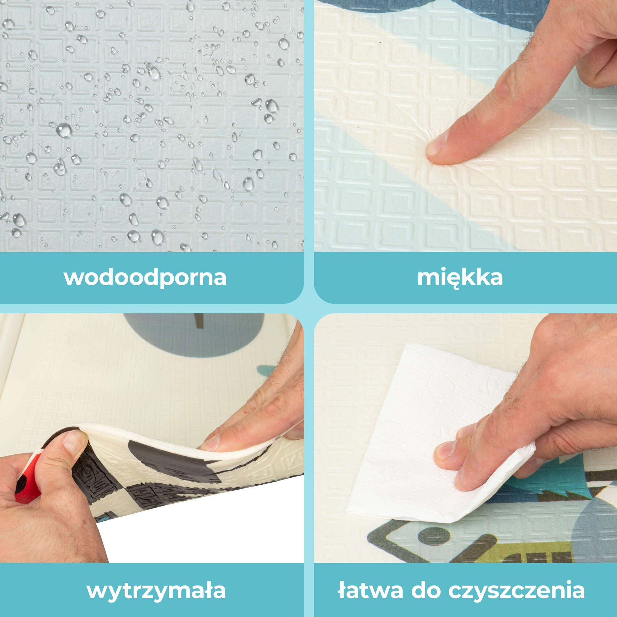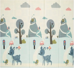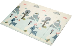 Prémiová pena XPE zabezpečuje výborné tlmenie nárazov, tepelnú izoláciu od studenej podlahy a dlhú životnosť. Obe strany podložky majú iné, edukatívne potlače – jemná „lesná cesta“ s rozkošnými zvieratkami a kontrastné motívy pre vizuálnu stimuláciu najmenších. Vďaka protišmykovej štruktúre je ideálna na bezpečnú hru, tummy-time aj učenie sa plaziť a chodiť.