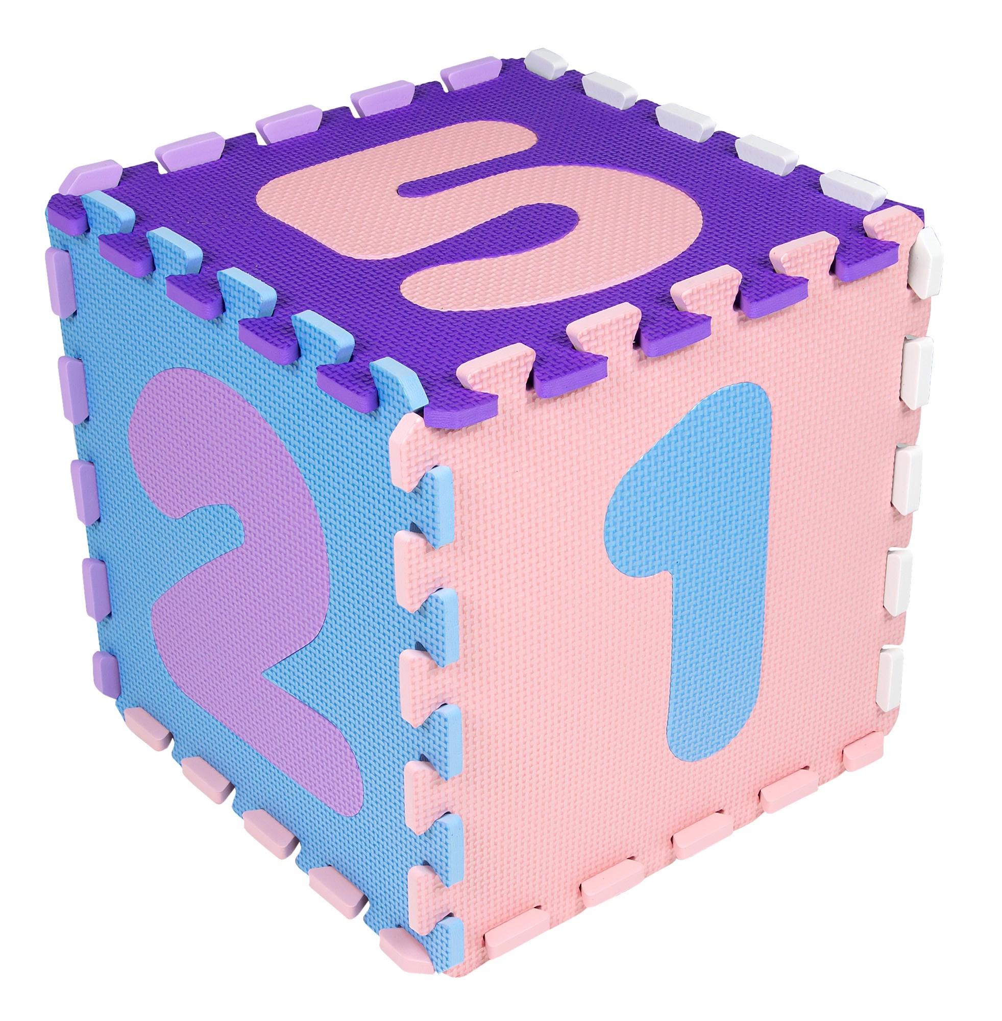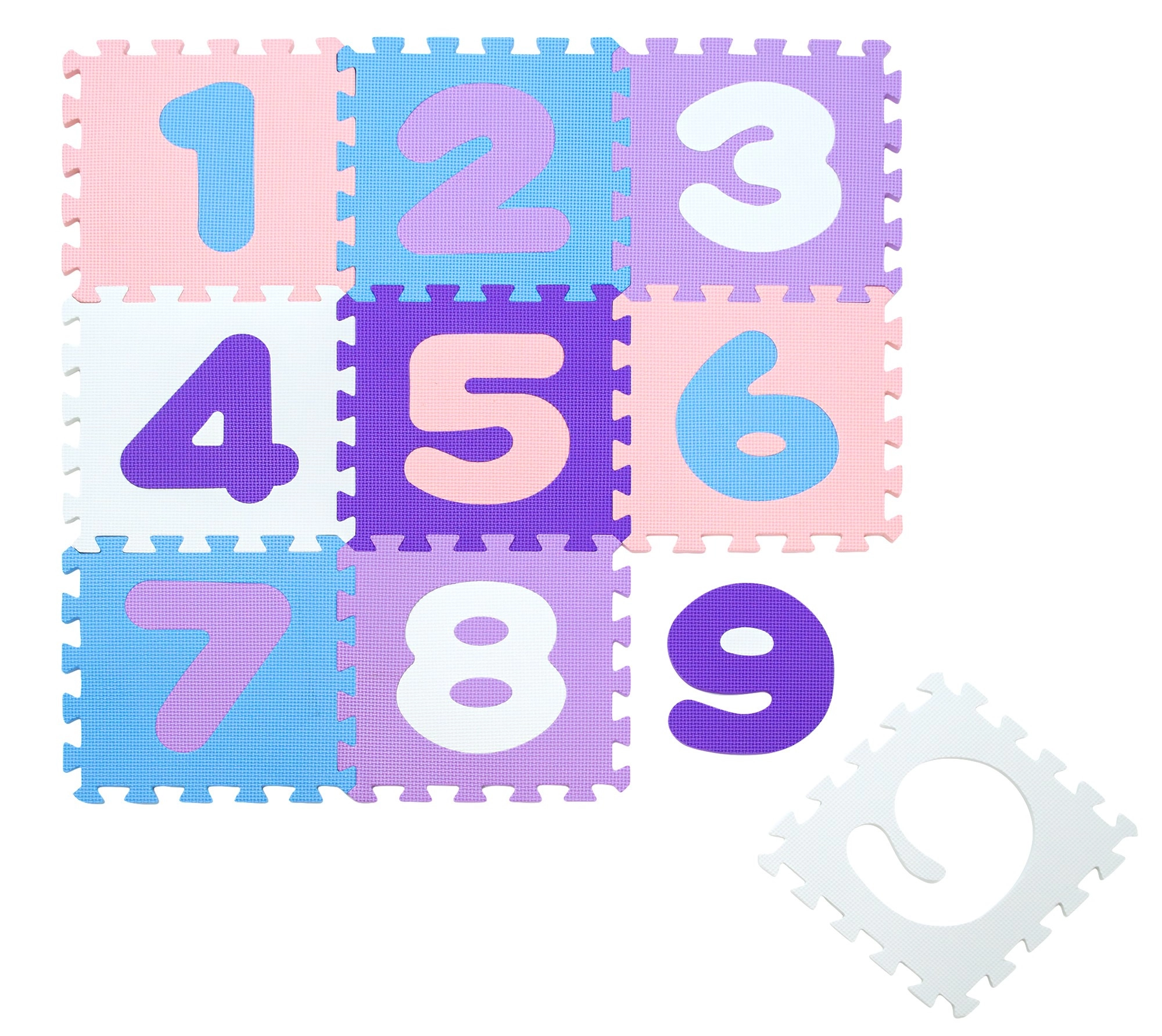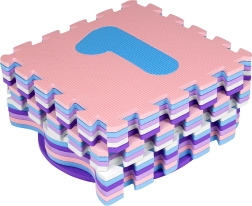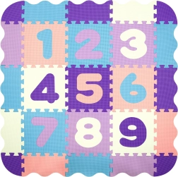 Každý diel má vyberateľný prvok – číslicu 1–9. Deti tak trénujú rozpoznávanie čísiel, koordináciu a priestorové myslenie. Diely možno spájať naplocho aj do 3D tvarov (napr. kocka). Materiál EVA je bez ftalátov, formamidu, BPA a PVC, výborne izoluje chlad od podlahy a tlmí nárazy.