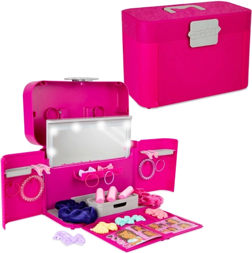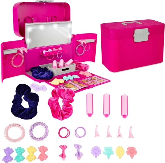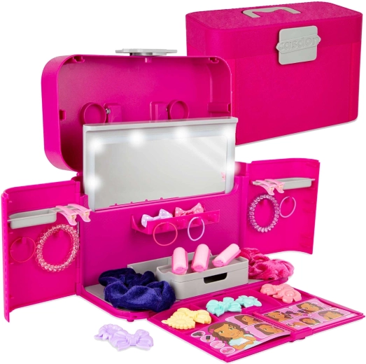 Vďaka širokej škále vlasových doplnkov môžu deti vytvárať nekonečno účesov pre seba, kamarátky aj bábiky. Premyslená organizácia úložných priehradiek, šuplíka a držiakov pomáha udržať všetko na svojom mieste – a po skončení hry sa celá výbava ľahko zavrie a vezme za rukoväť.