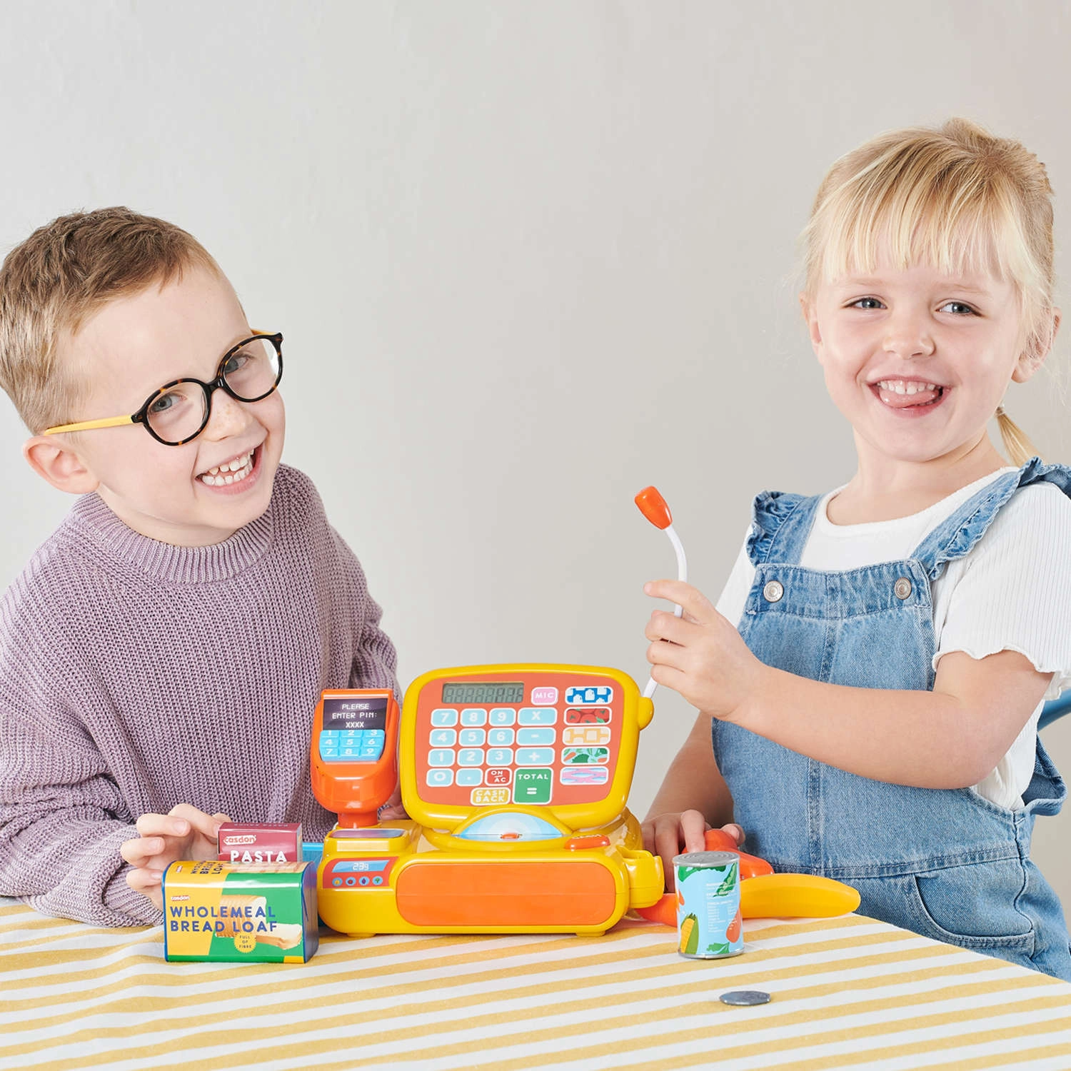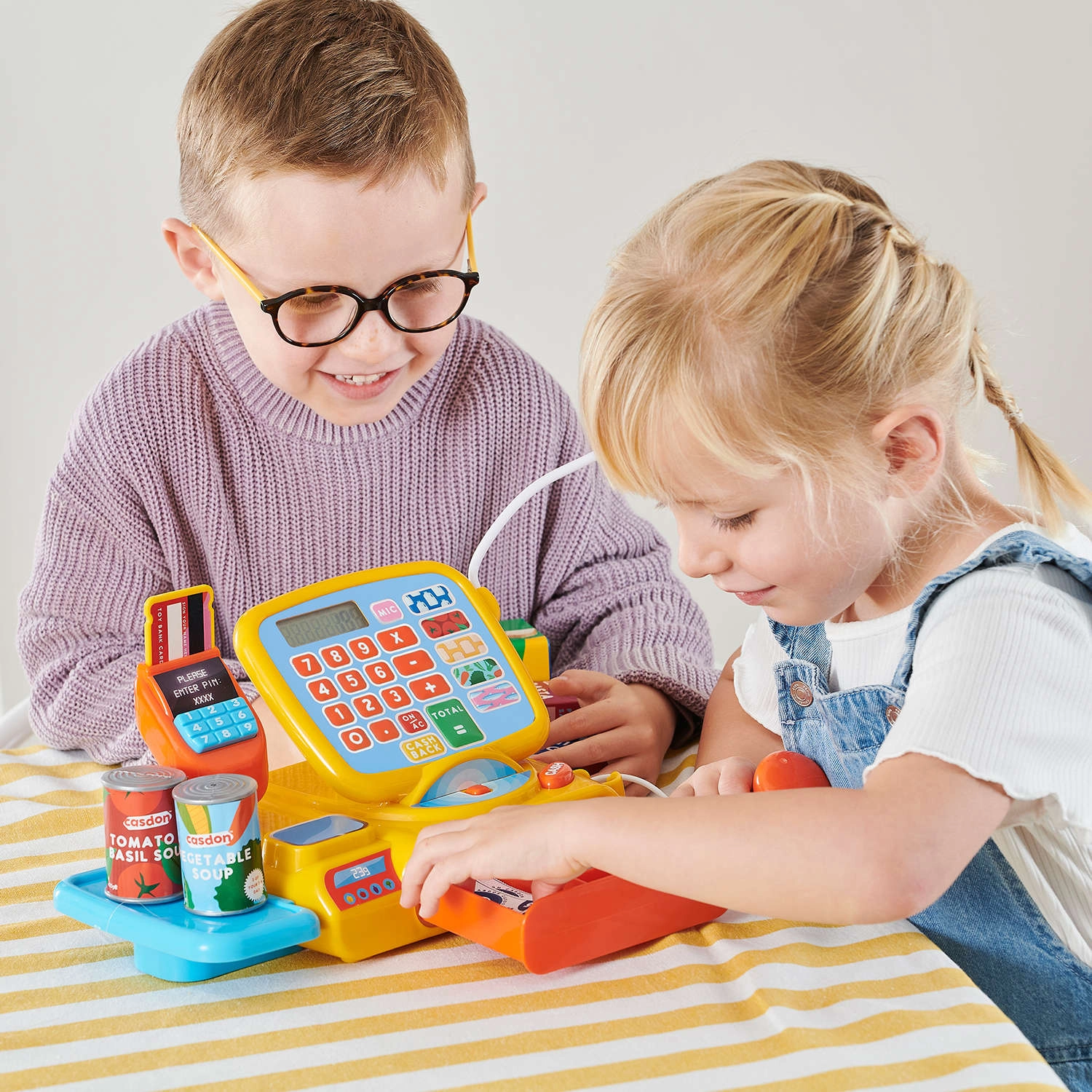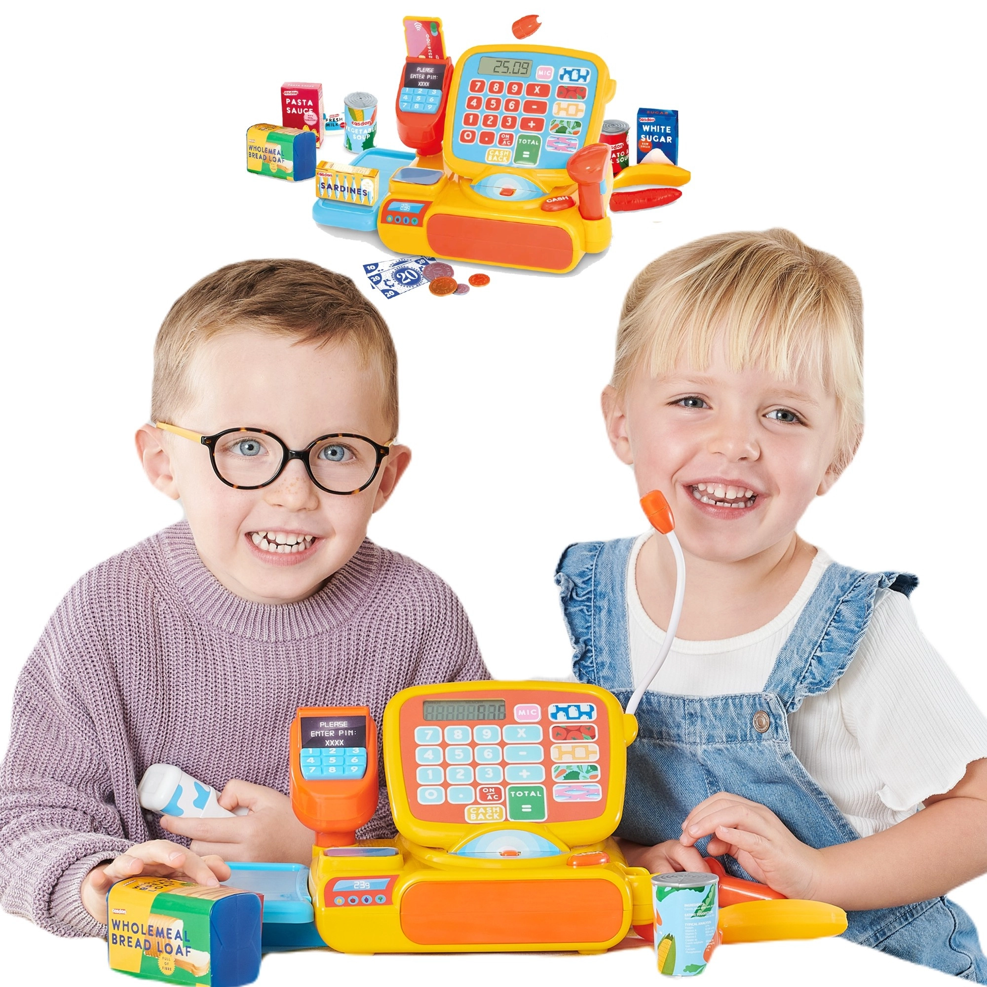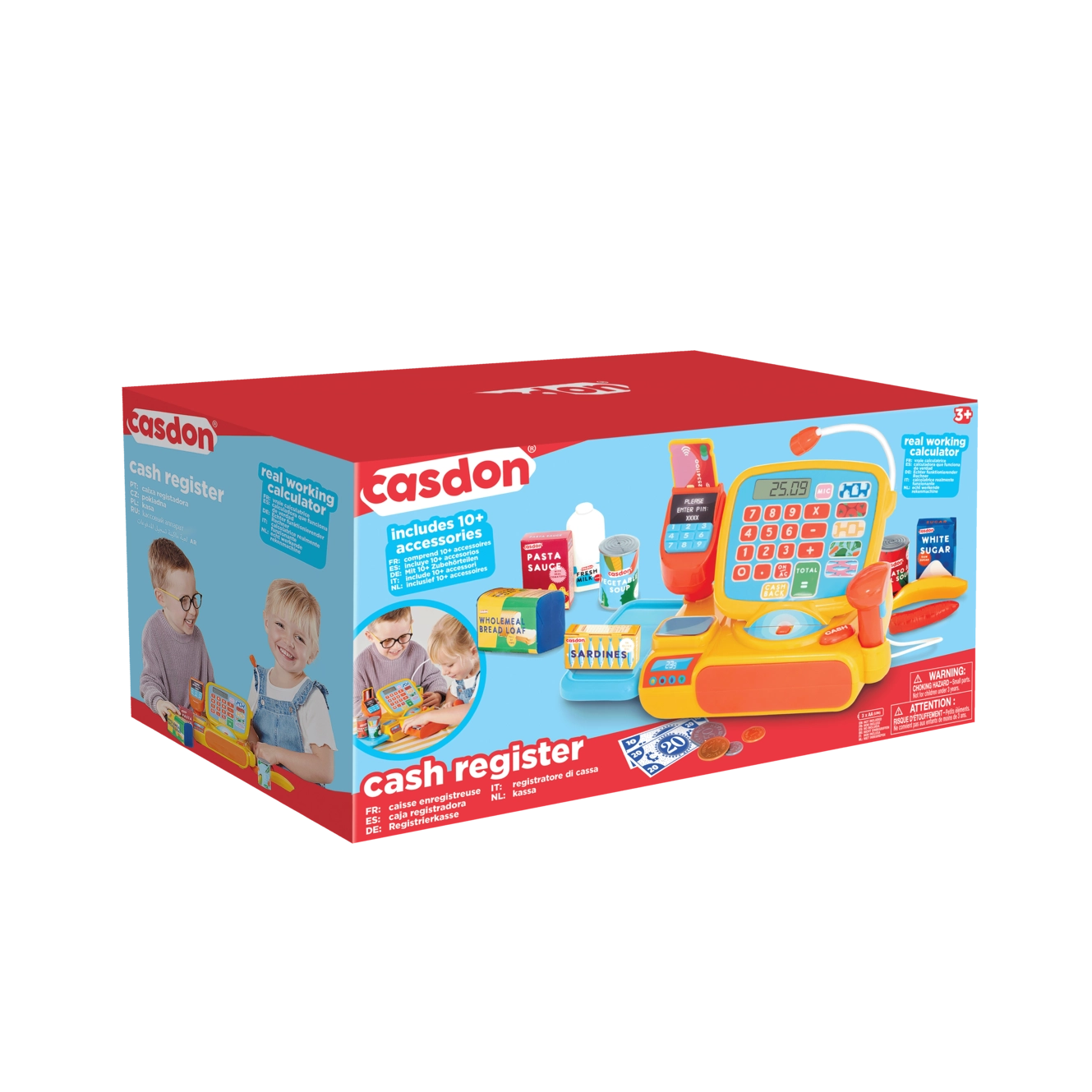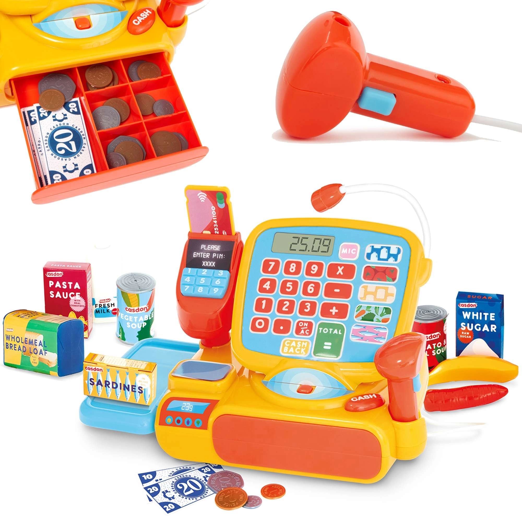 Farebná detská pokladňa CASDON ponúka realistickú hru na obchod s bohatým príslušenstvom. Má funkčný displej s kalkulačkou, skener čiarových kódov, čítačku kariet, váhu a výsuvnú zásuvku na peniaze. Súčasťou sú bankovky, mince, platobná karta a makety potravín. Nechýbajú zvukové efekty a mikrofón pre ešte realistickejší zážitok.