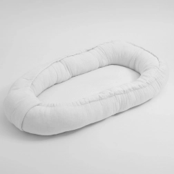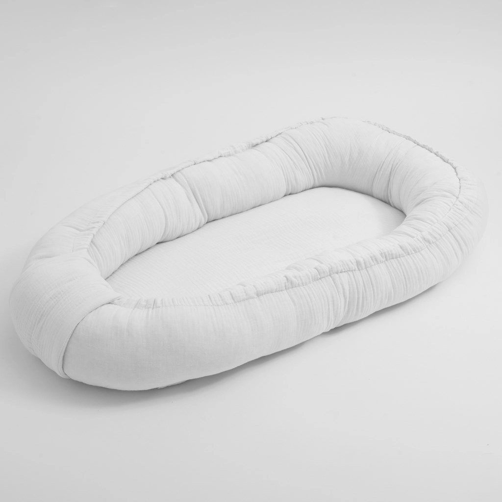 Hebučké mušelínové hniezdo New Baby v bielej farbe poskytne bábätku bezpečné a pohodlné zázemie doma aj na cestách. Vďaka mäkkým okrajom a priedušnému bavlnenému materiálu sa dieťatko cíti pokojne a v bezpečí, a môže tak lepšie spať, oddychovať aj hrať sa. Skvelé na umiestnenie do postieľky, na gauč, na zem alebo do kočíka.