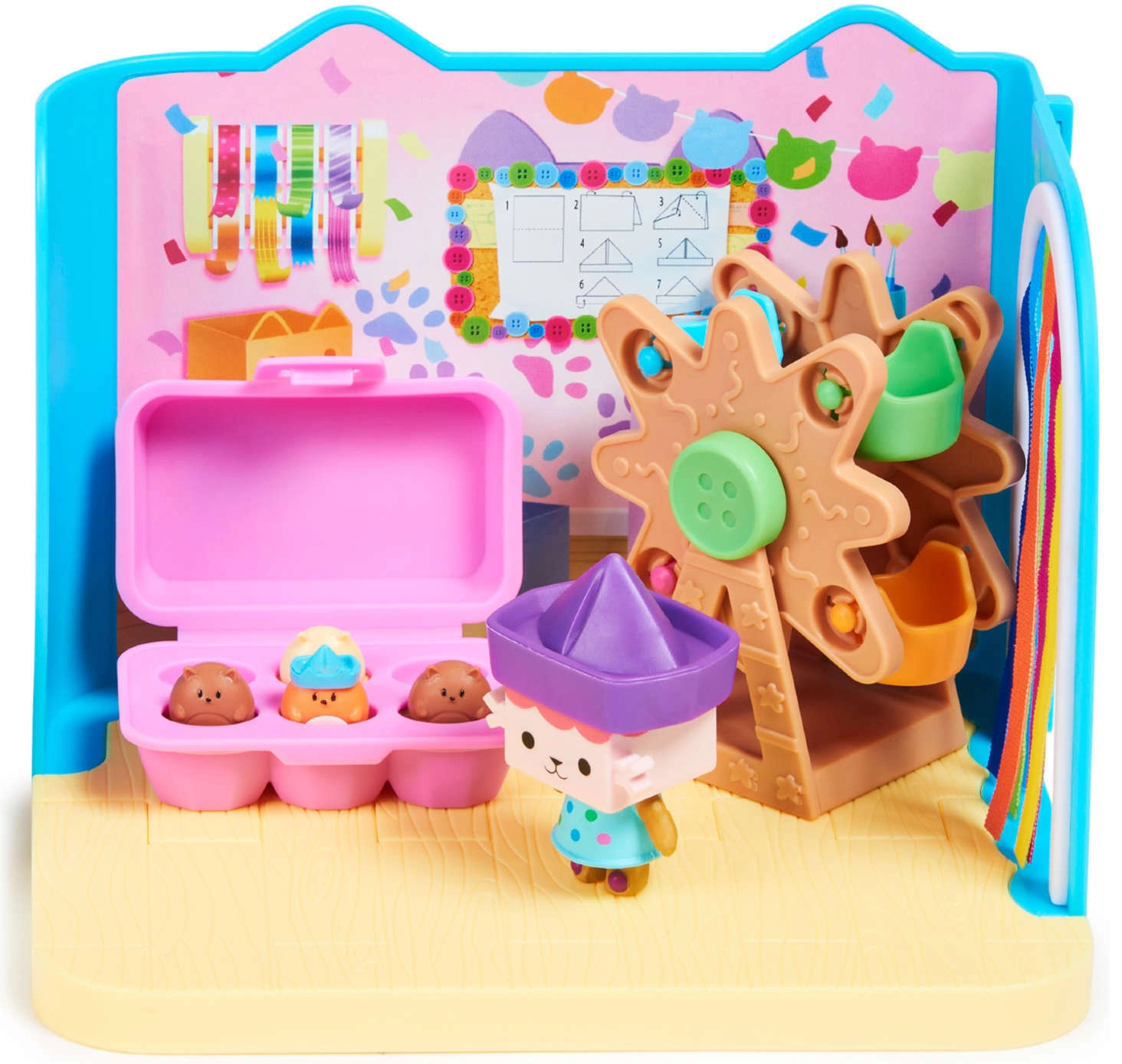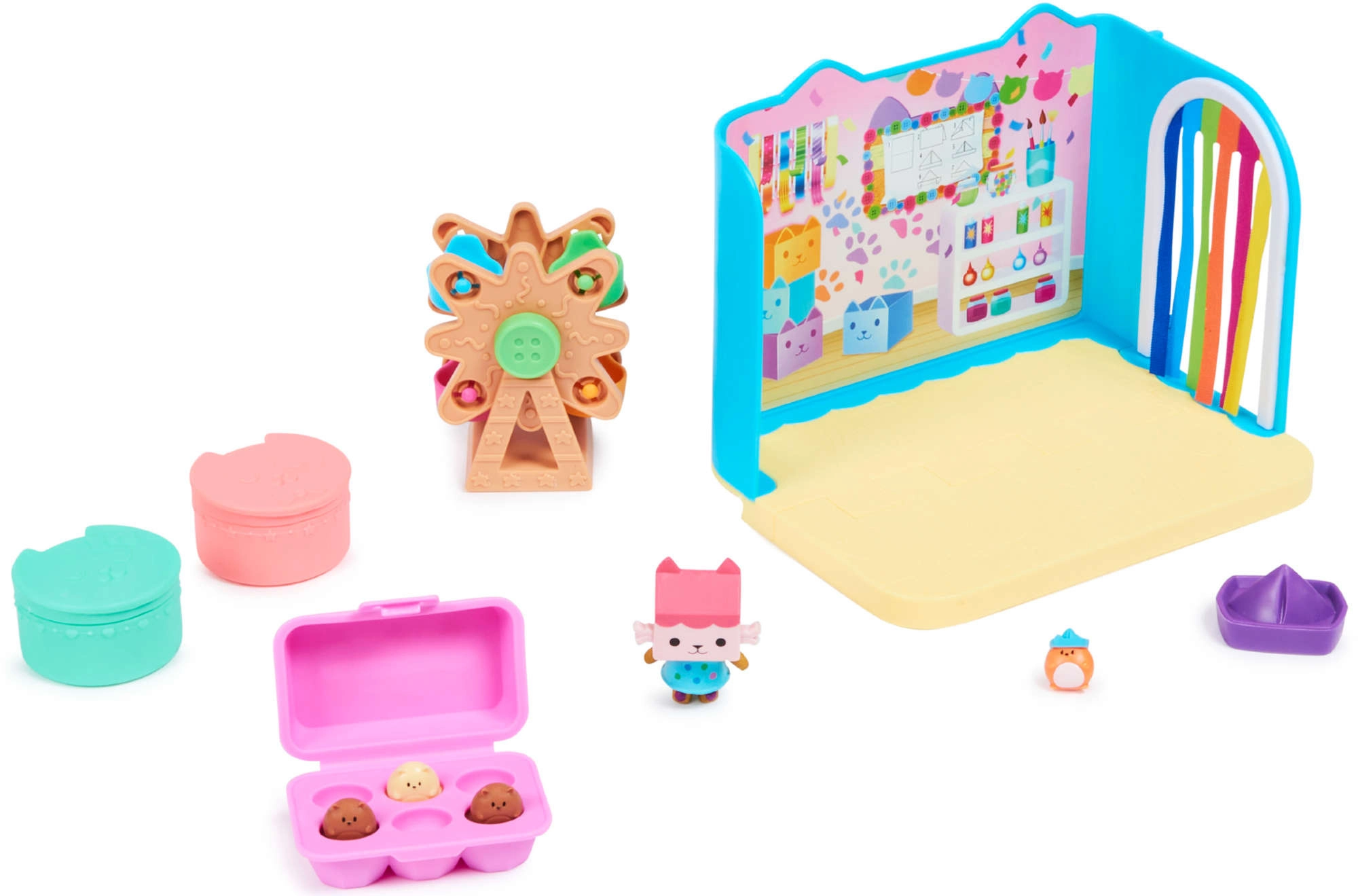 Set „Baby Box Craft-a-riffic Room“ je originálny prírastok do herného systému Gabby’s Dollhouse – možno ho použiť samostatne alebo prepojiť s veľkým domčekom.