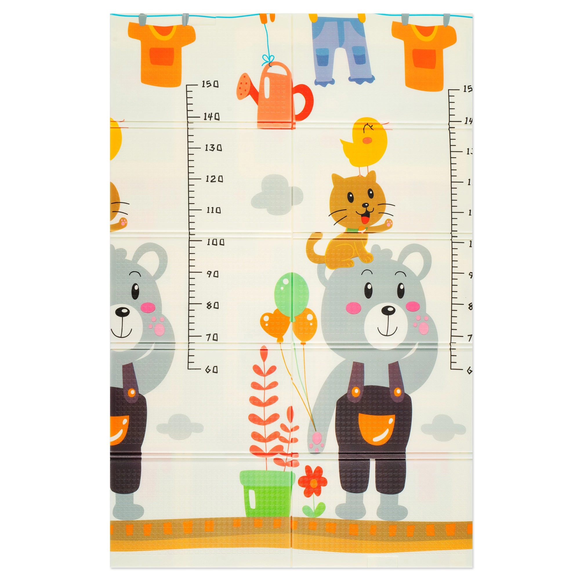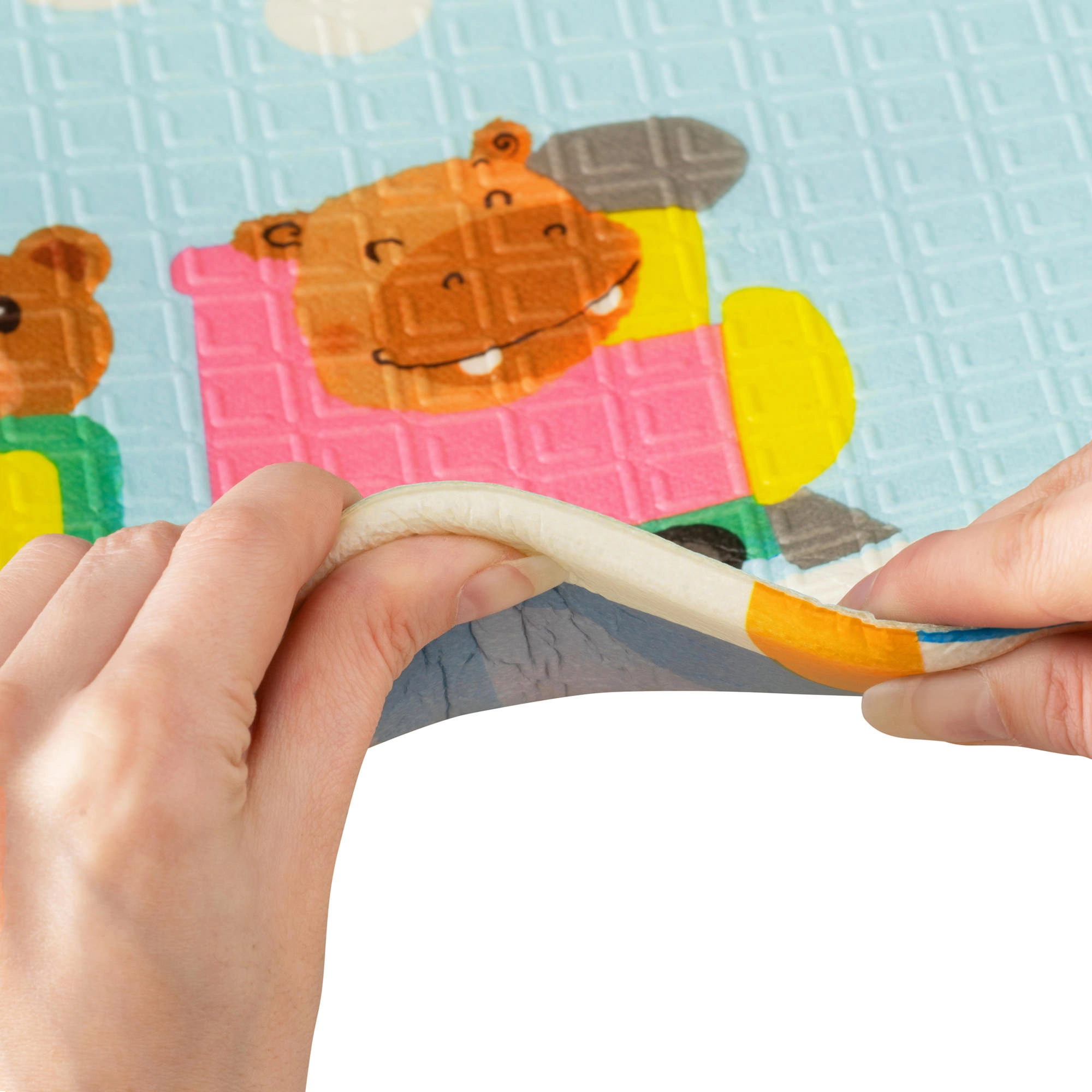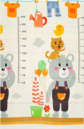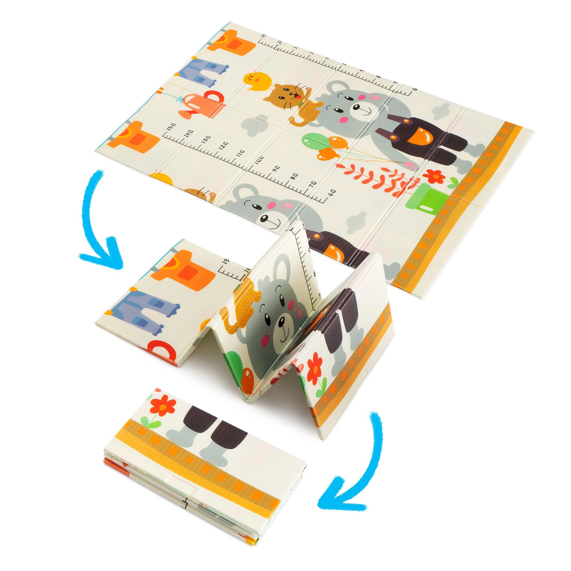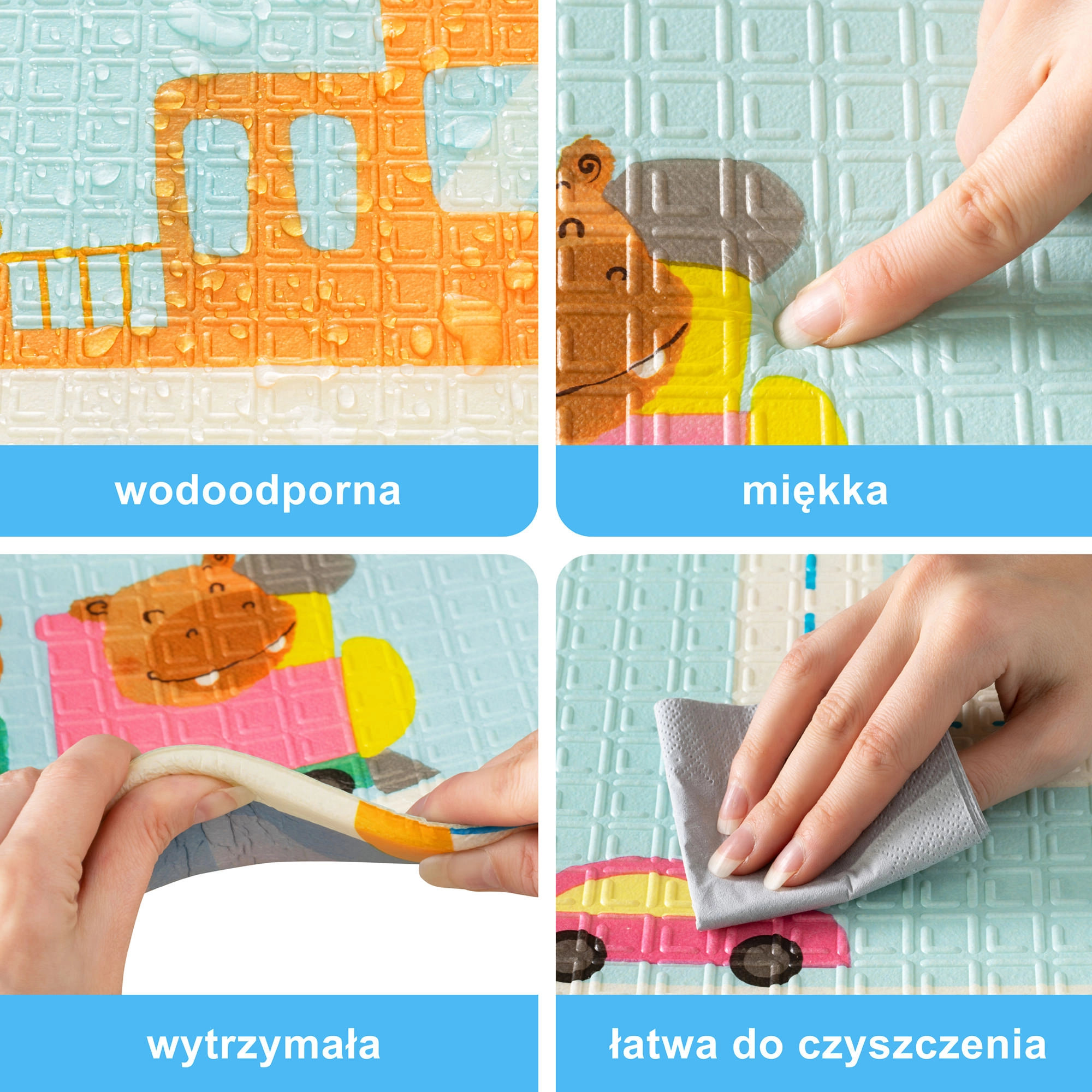 Obojstranný dizajn prináša dva edukatívne motívy: veselé zvieratká s výškovou mierkou na sledovanie rastu a farebné cesty s budovami a vozidlami na rozvoj fantázie. Podložku jednoducho zložíte počas pár sekúnd, ľahko ju uložíte a vďaka priloženej taške na zips vezmete kamkoľvek – do obývačky, detskej izby, na balkón, záhradu aj na cesty.