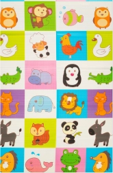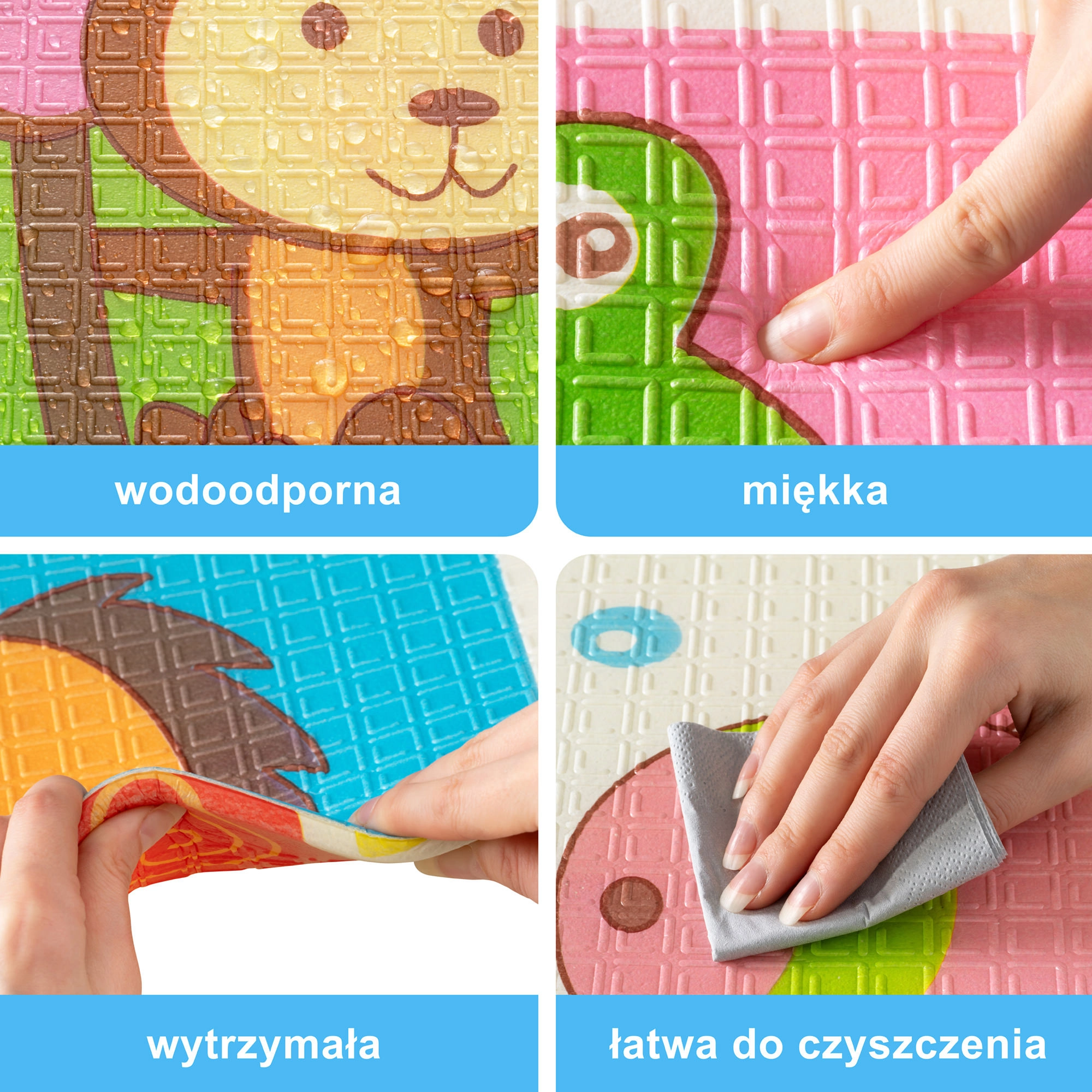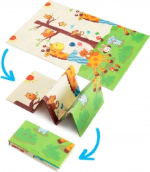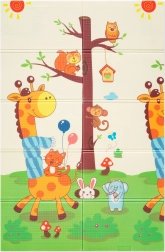 Prémiová pena XPE je bez zápachu, netoxická a odolná voči opotrebovaniu. Vďaka svojej hrúbke 0,8 cm výborne tlmí nárazy a zabezpečuje izoláciu od chladnej podlahy. Obe strany zdobia atraktívne potlače – jedna s roztomilými žirafami, druhá so zvieratkami na farebnom pozadí – ktoré podporujú vizuálny rozvoj detí.