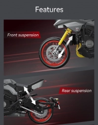 Vďaka pohyblivým prvkom si užijete tak stavbu, ako aj následnú prezentáciu: model má otočné riadidlá, priehľadný motor s pohyblivými piestami napojený na zadné koleso, pracujúcu reťaz, trojstupňovú prevodovku, funkčné odpruženie a nastaviteľný stojan. Nechýba reflektor, spätné zrkadlá, prístrojová doska, brzdové kotúče a precízne tvarované kapoty.