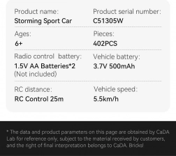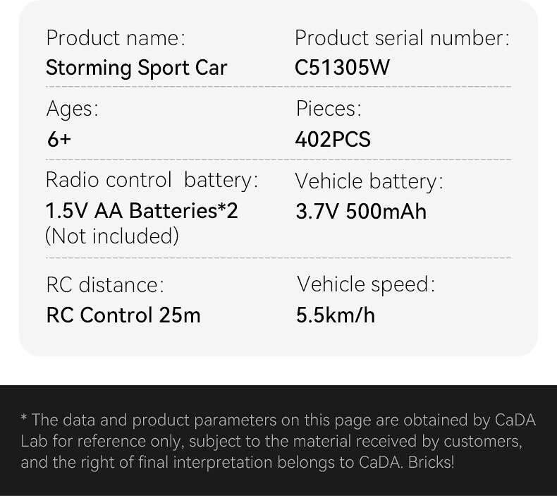 Športový voz CaDA vyniká realistickými proporciami, pevnou konštrukciou a atraktívnou bielou karosériou s čiernymi prvkami. Vďaka pohonom a presnému riadeniu si užijete plynulú jazdu vpred aj vzad a presné zatáčanie. Dual Mode umožní ovládať model klasickým ovládačom alebo smartfónom s Bluetooth – zábava doma aj vonku.