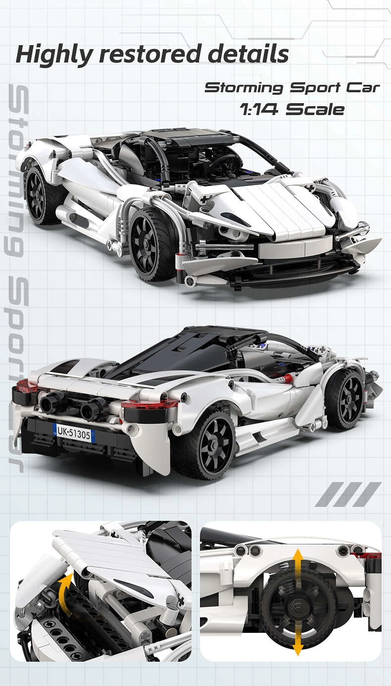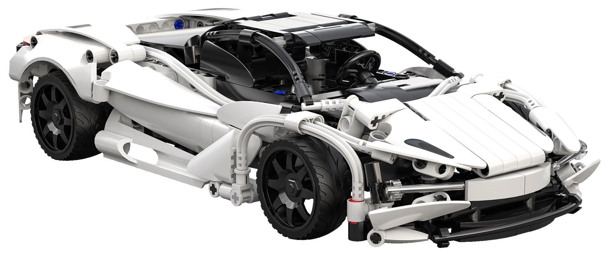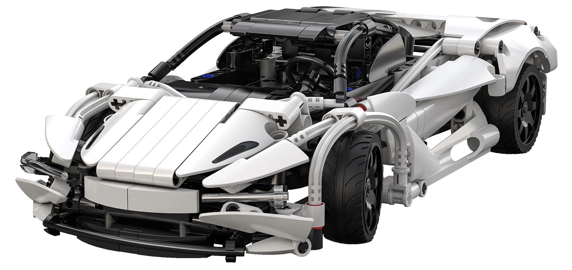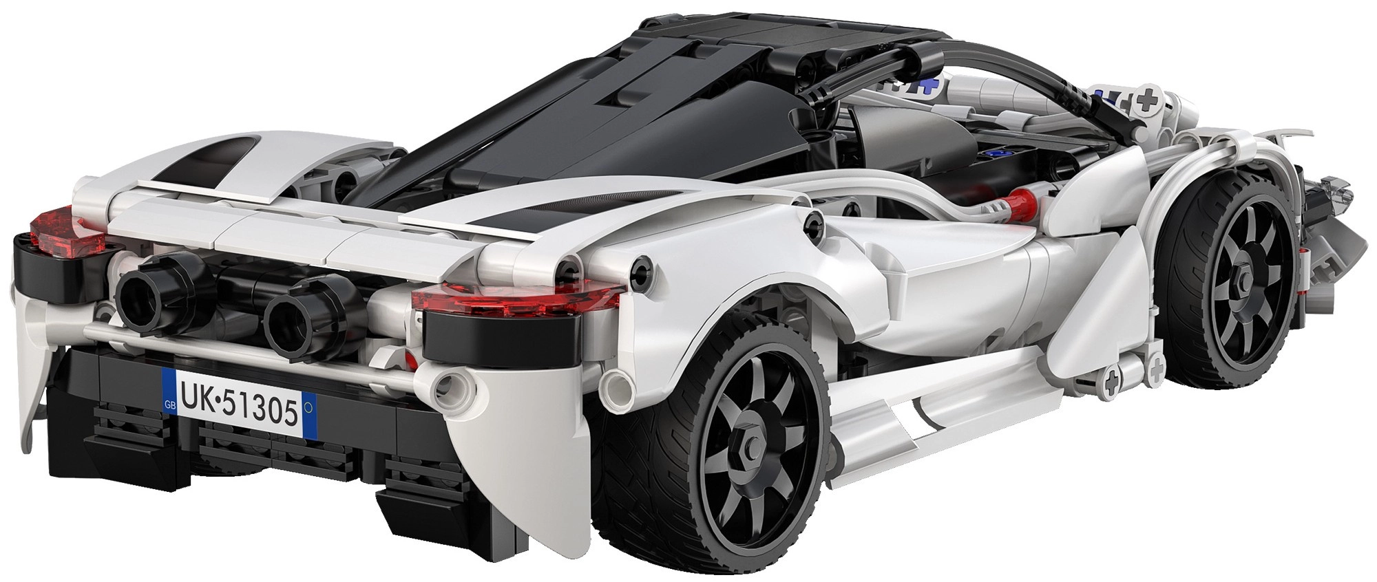 Detailná biela karoséria s čiernymi prvkami, otvárateľná kapota a gumené kolesá pre istý kontakt s povrchom. Skvelý vzhľad aj funkcie.