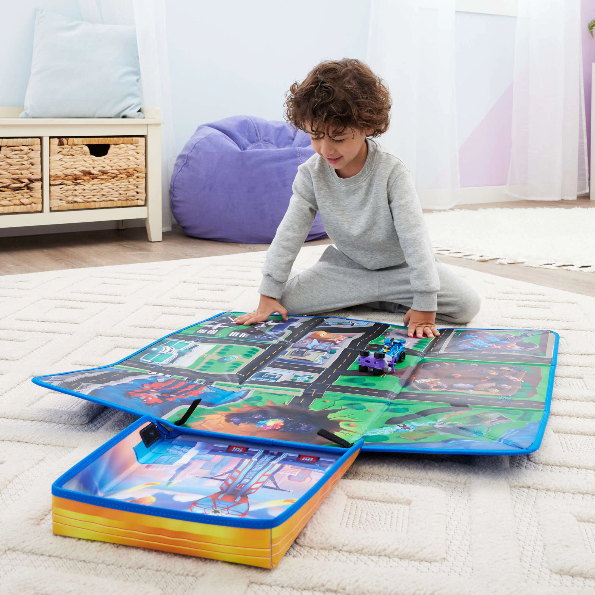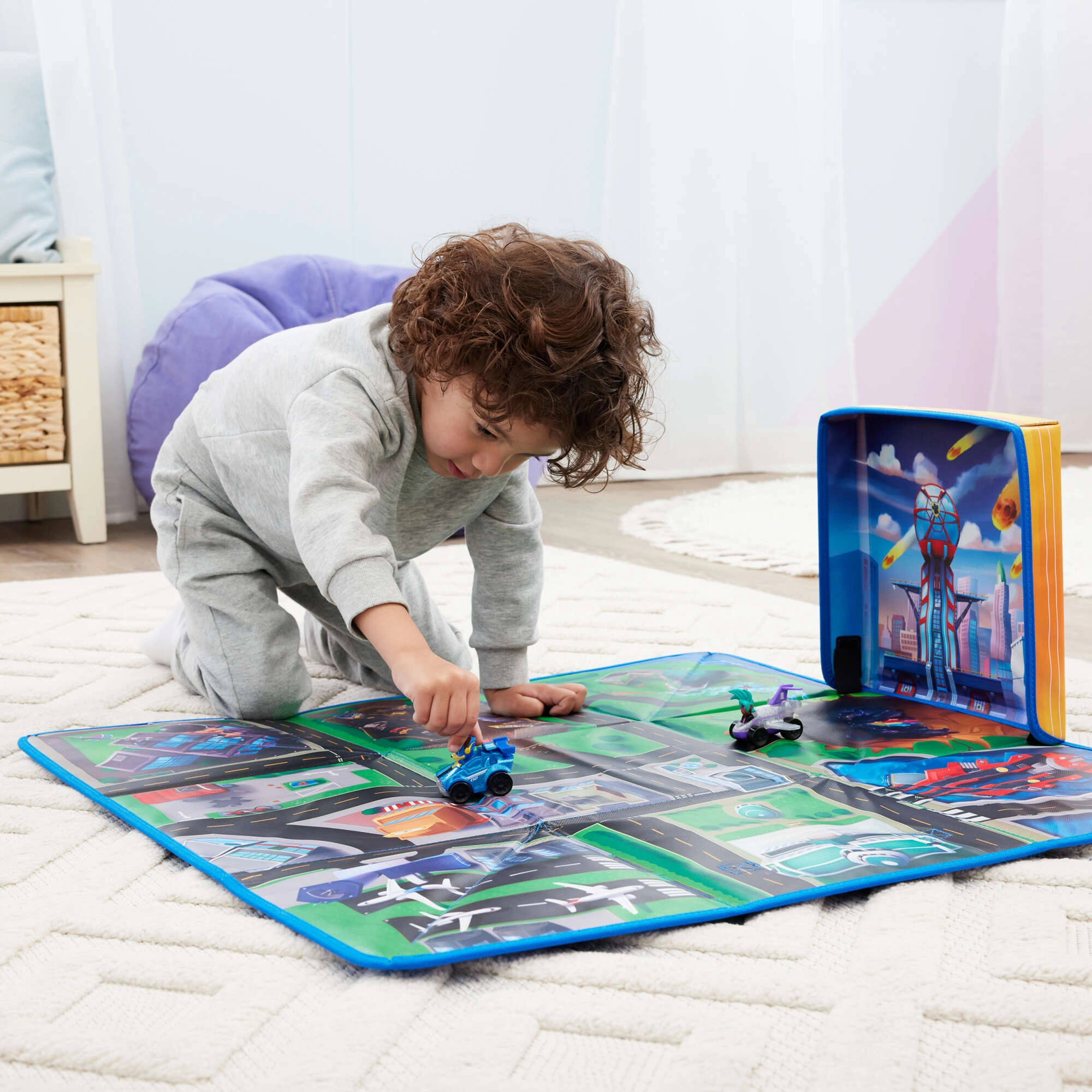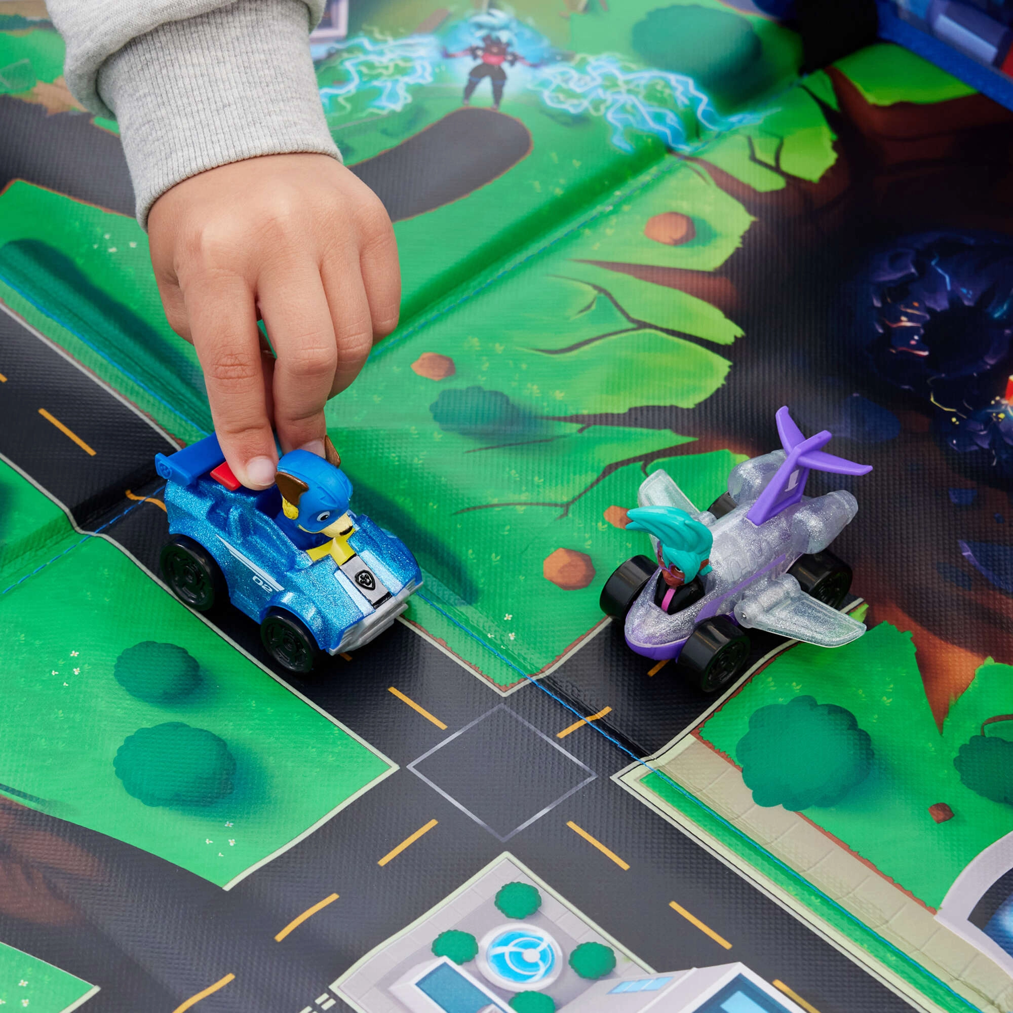 Po skončení hry sa podložka behom chvíľky premení na stabilný úložný box 25,4 × 25,4 × 25,4 cm, do ktorého sa zmestia autíčka aj figúrky. V balení nájdete aj vozidlo Chase Rescue Racer a exkluzívne vozidlo Vee Rescue Racer, takže môžete začať jazdiť hneď po rozbalení.