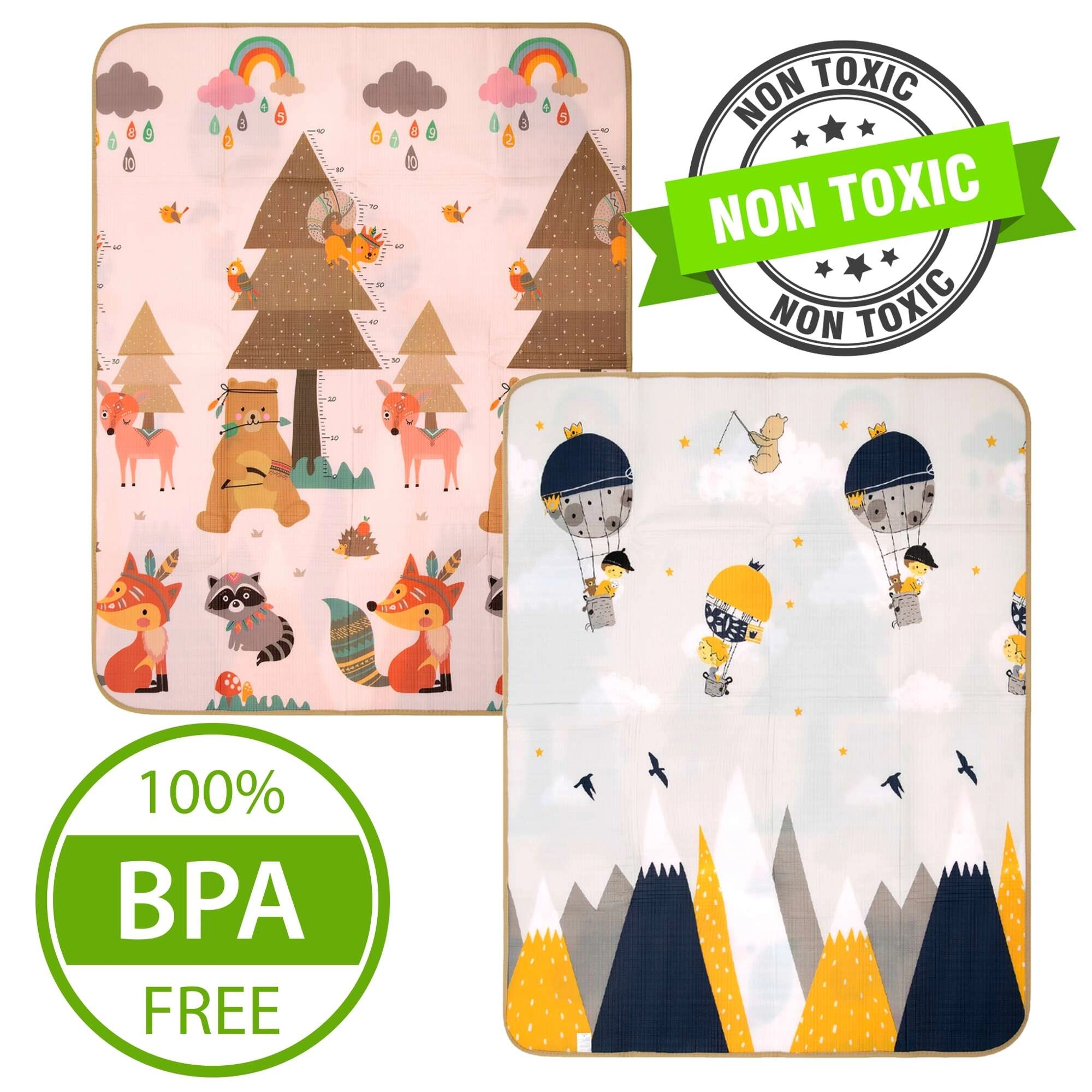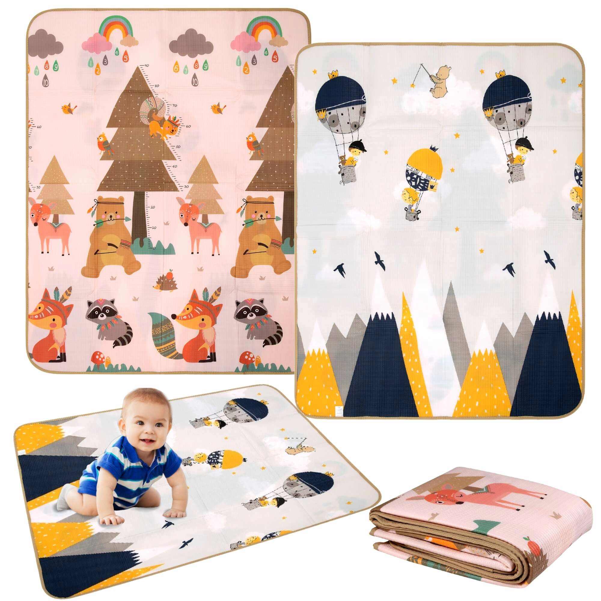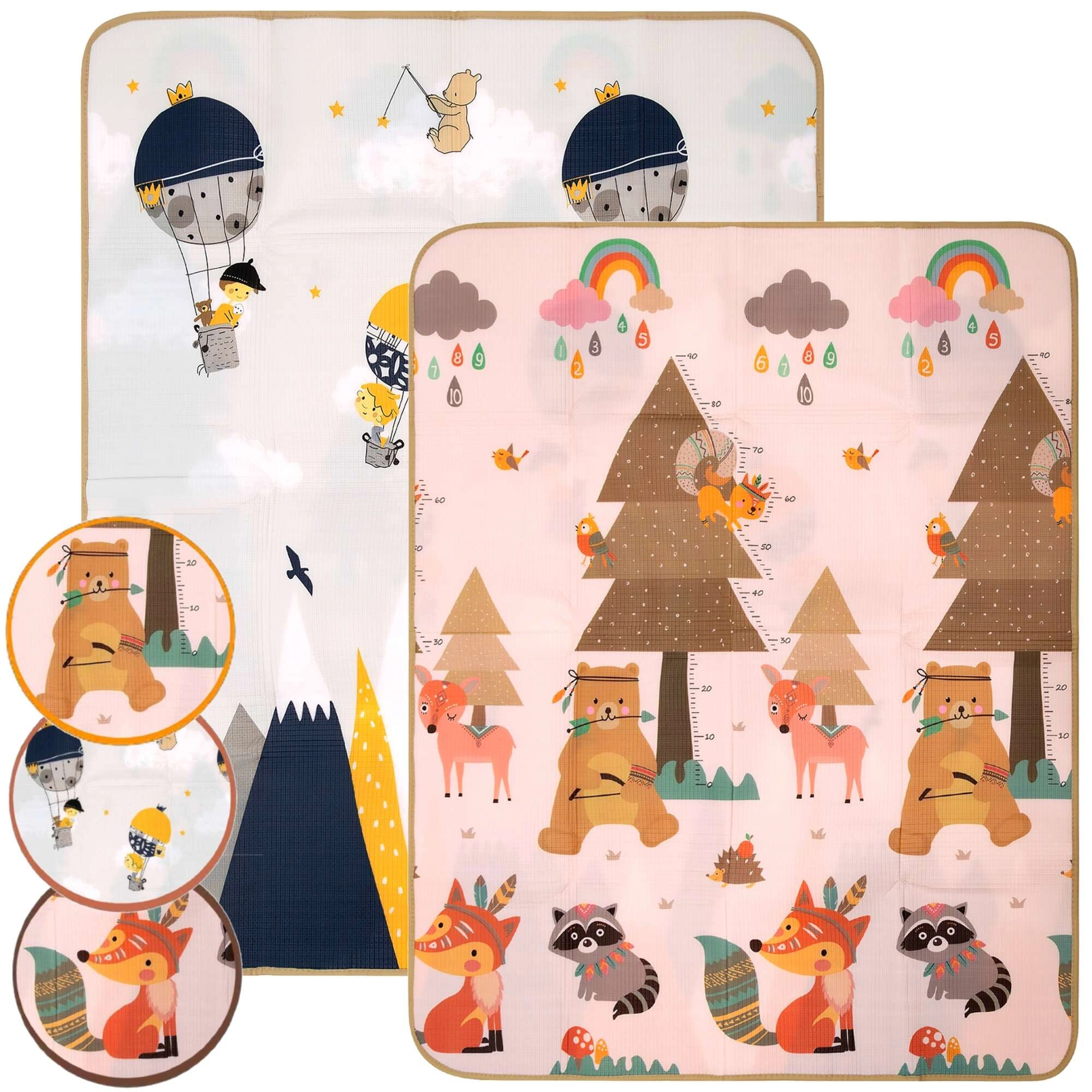- Obojstranný dizajn 2v1 – zvieratká, hory, balóniky a mierka rastu