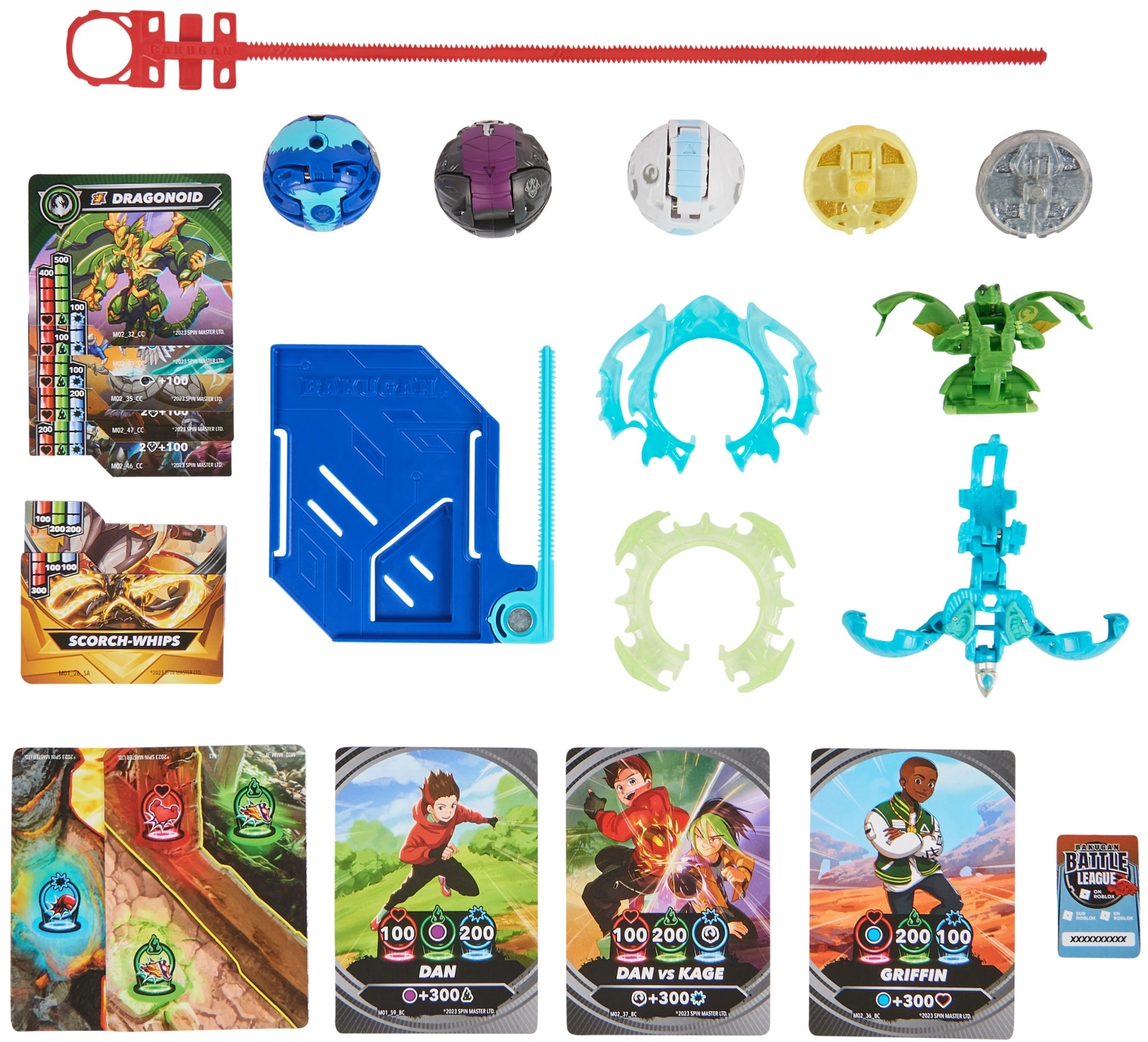 - 3× Bakugan Top, 3× Bakugan Bottom, 2× SA Bakugan Top, 2× SA Bakugan Bottom, 2× SA Power Ring, 2× SA Bakugan Card, 1× Bakugan Ripcard, 1× XL Bakugan Ripcord, 1× Bakugan Token, 3× Karty bojovníkov, 5× Karty postáv, 2× Gate karty, 1× zberateľský list