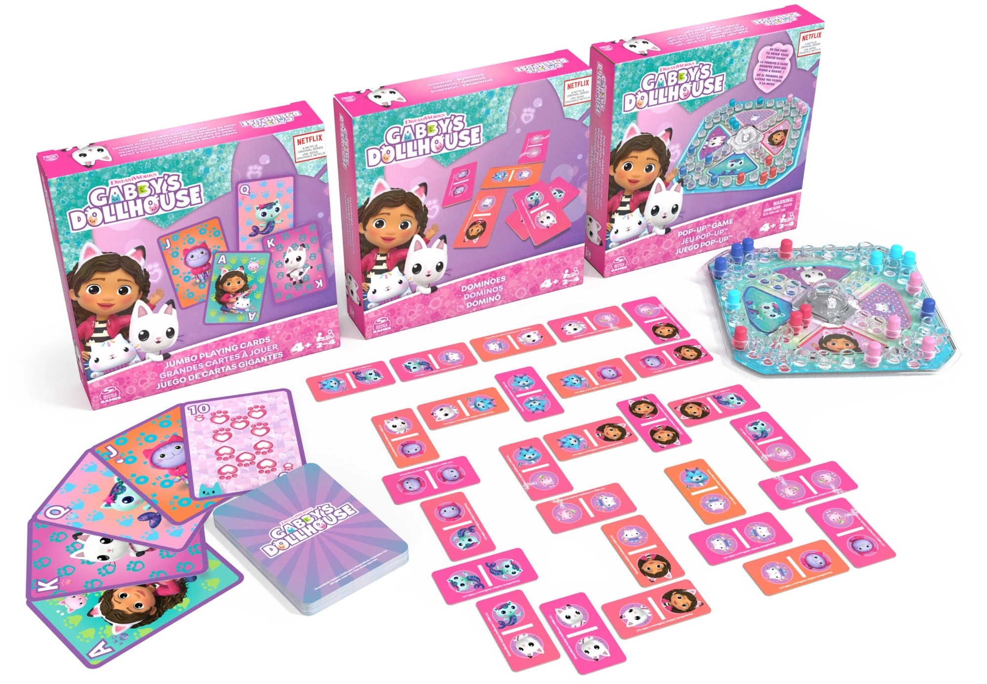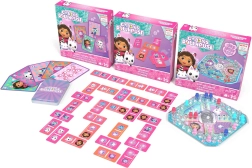 Objavte tri populárne rodinné hry v jednom balení s motívmi seriálu Gabin mačací domček. Deti si užijú ukladanie obrázkov v domine, napínavé preteky po plastovom pláne s kockou pod kupolou Pop-Up aj hranie s veľkoformátovými jumbo kartami.