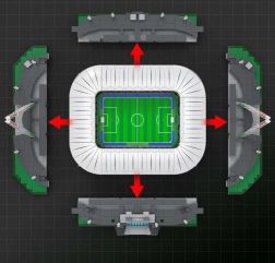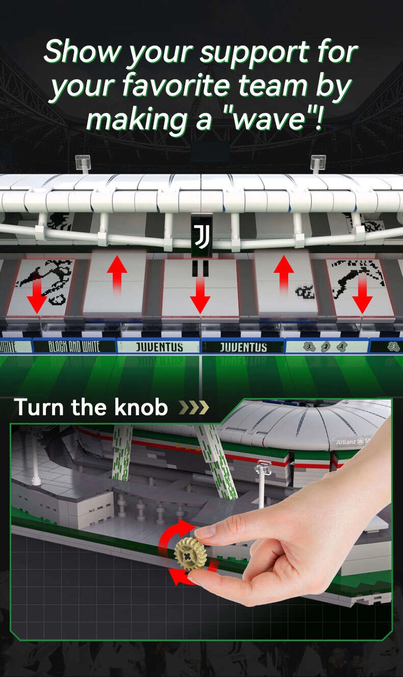 Model je rozdelený do šiestich modulov (ihrisko, štyri tribúny a strecha), takže ho ľahko rozložíte a prezriete interiér. Unikátna funkcia „vlna“ umožní pomocou otočného ovládača rozhýbať sedadlá hore a dolu – presne ako na skutočnom štadióne. Vďaka premyslenému dizajnu a pevnej konštrukcii je ideálny na stavanie, vystavenie aj pre zberateľov.