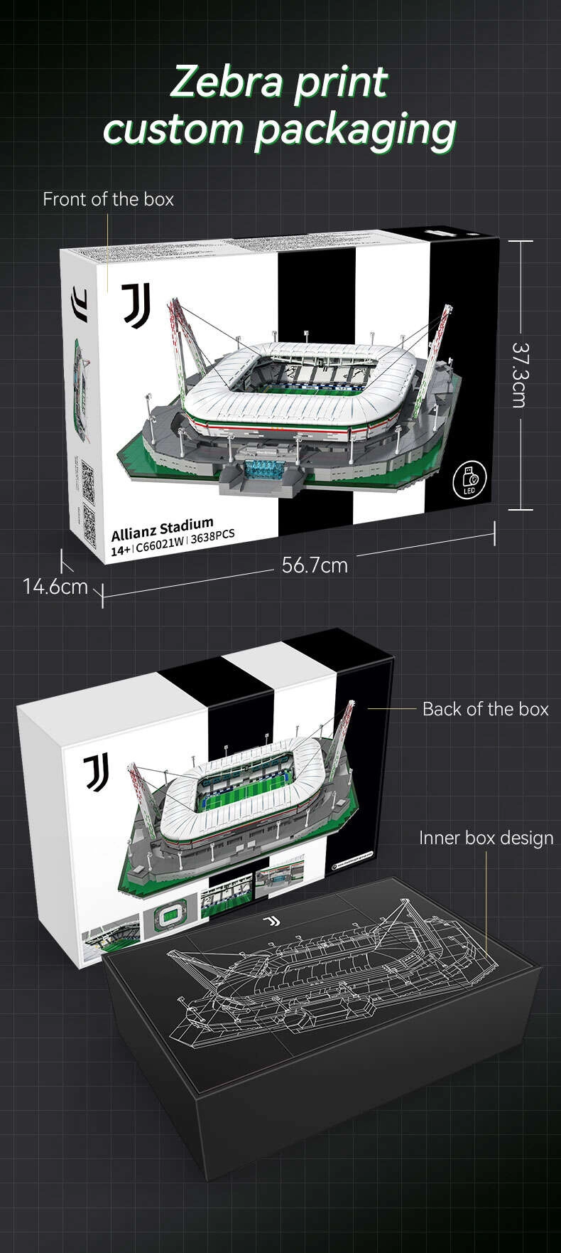 Vytvorte si doma verný model štadióna Allianz Stadium v Turíne – domovskú arénu talianskeho futbalu. Set CaDA prináša pôsobivú architektúru so značeným ihriskom, tribúnami, vstupmi, fasádnymi prvkami a charakteristickými nosnými pylónmi a káblami. Súčasťou je LED svetelný modul s ôsmimi režimami, ktorý premení model na efektný výstavný kus.