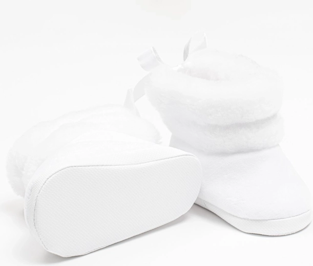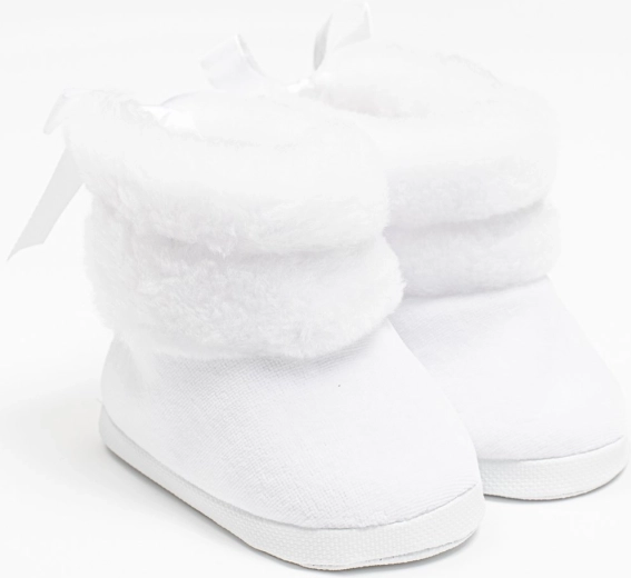 Roztomilé a praktické dojčenské zimné čižmičky New Baby v bielej farbe pre bábätká 0–3 mesiace. Sú mäkučké a hrejivé, vyrobené zo semišu s jemnou wellsoft podšívkou pre maximálne pohodlie. Vďaka šnurovaniu skvele držia na nožičke, majú široký vnútorný priestor pre voľný pohyb prštekov a ľahučkú tenkú podrážku. Ideálne na zimu do kočíka – nie sú určené na chôdzu.