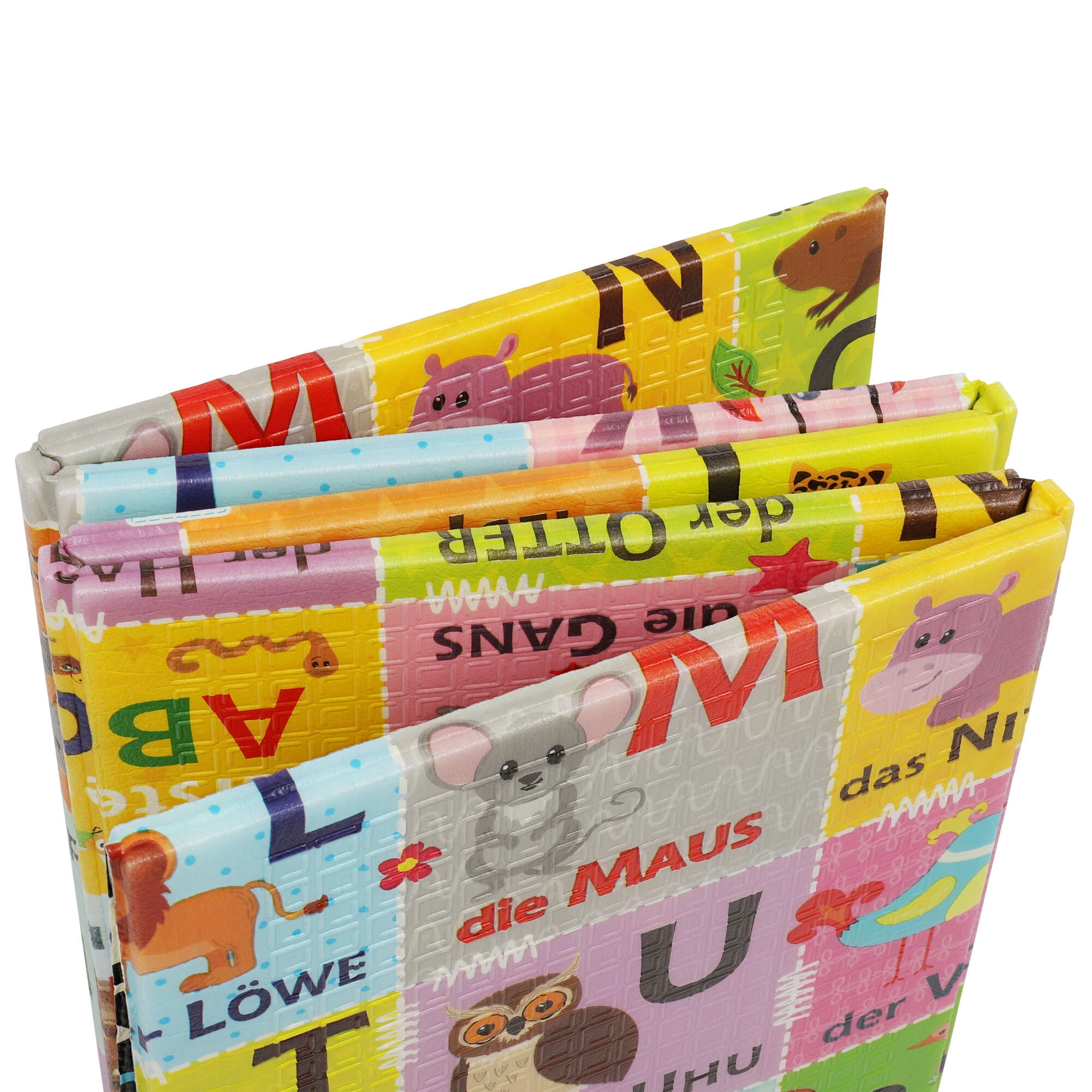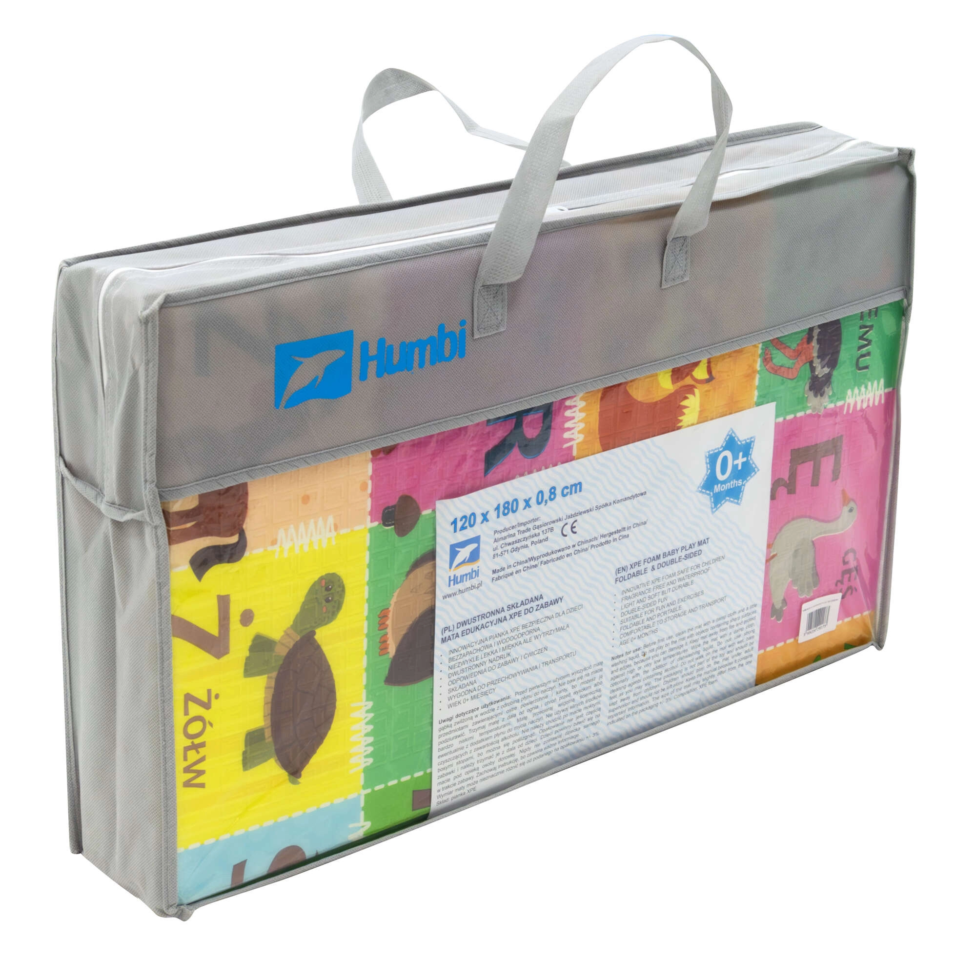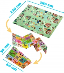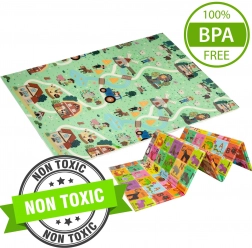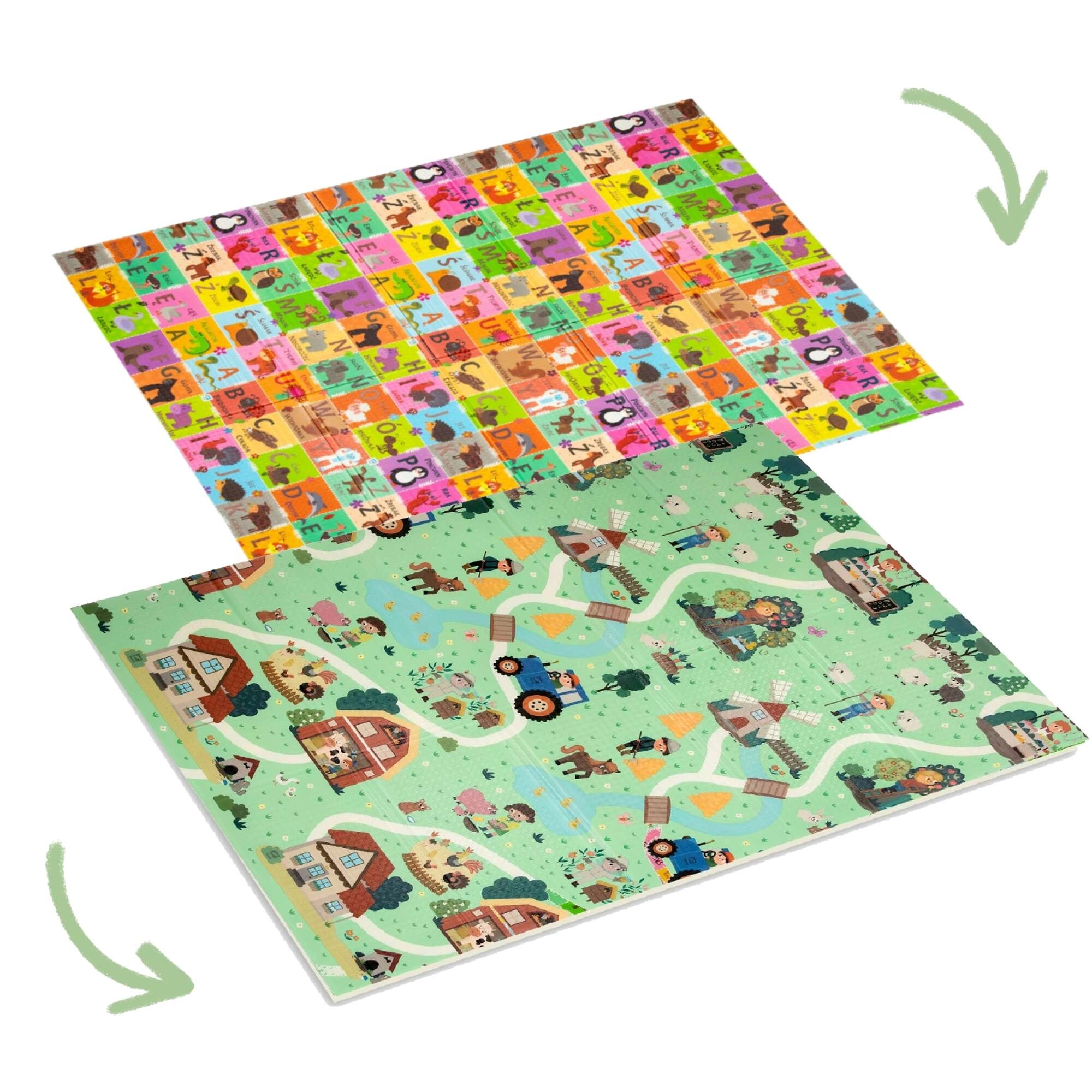 Obojstranný dizajn podporuje učenie a kreativitu: jedna strana s farebnou abecedou a zvieratkami rozvíja poznávanie písmen, druhá strana s dedinou, domčekmi a cestami nabáda k fantazijným hrám. Podložka je protišmyková, vodeodolná a hygienická – stačí ju utrieť vlhkou handričkou. Vďaka skladacej konštrukcii ju rýchlo zložíte, ľahko uložíte a pomocou priloženého vrecka s uškom pohodlne prenesiete.