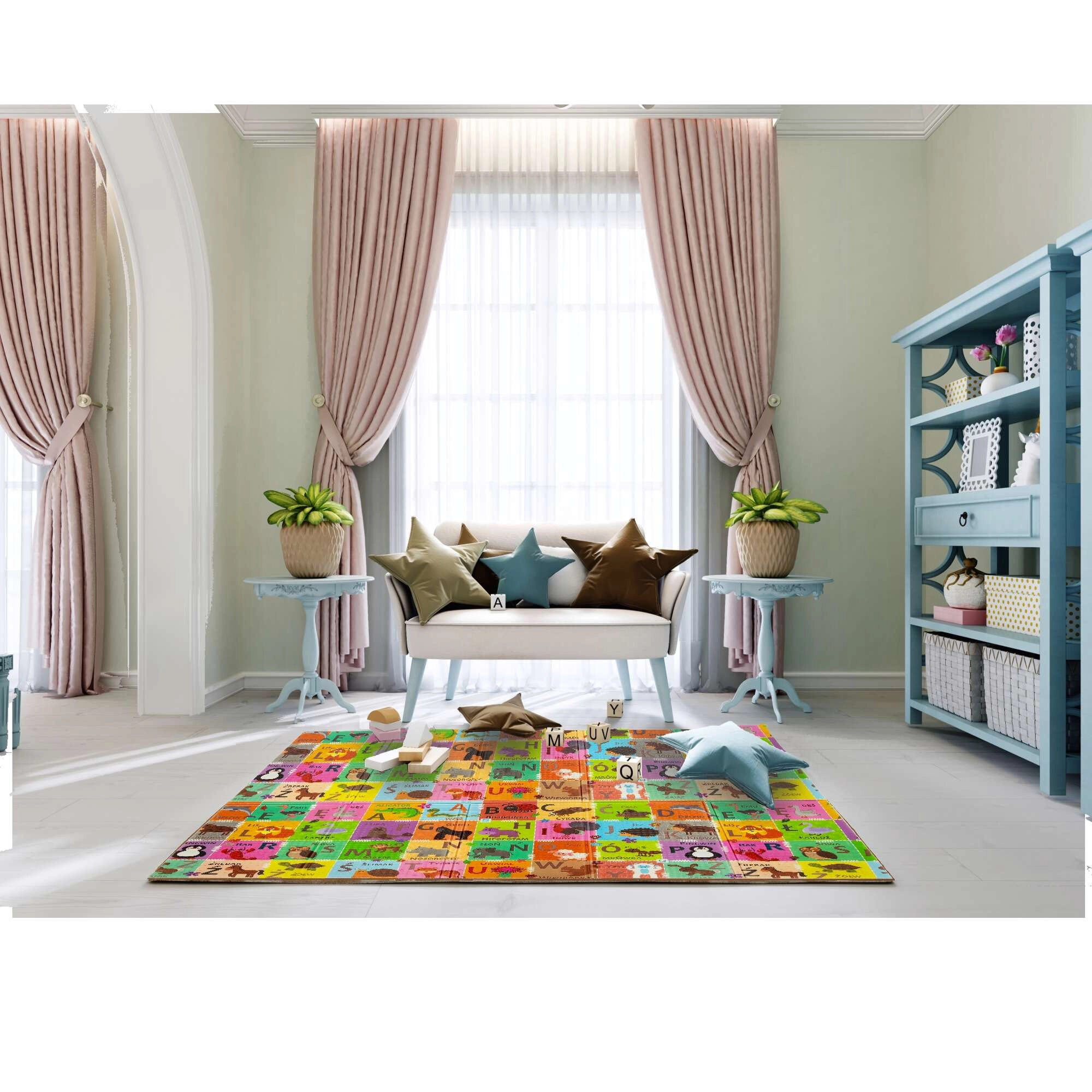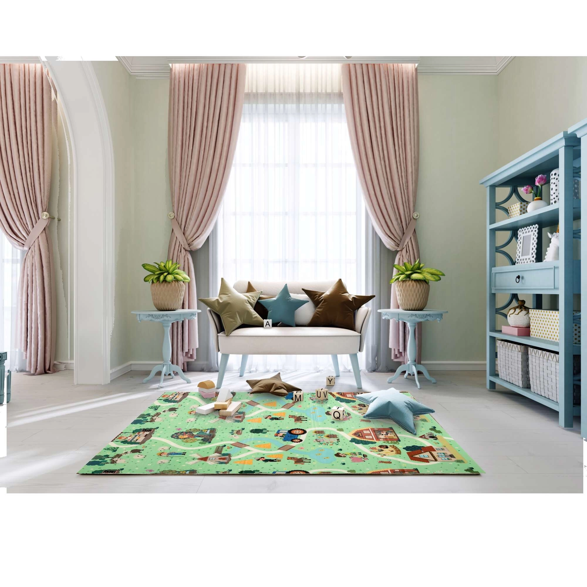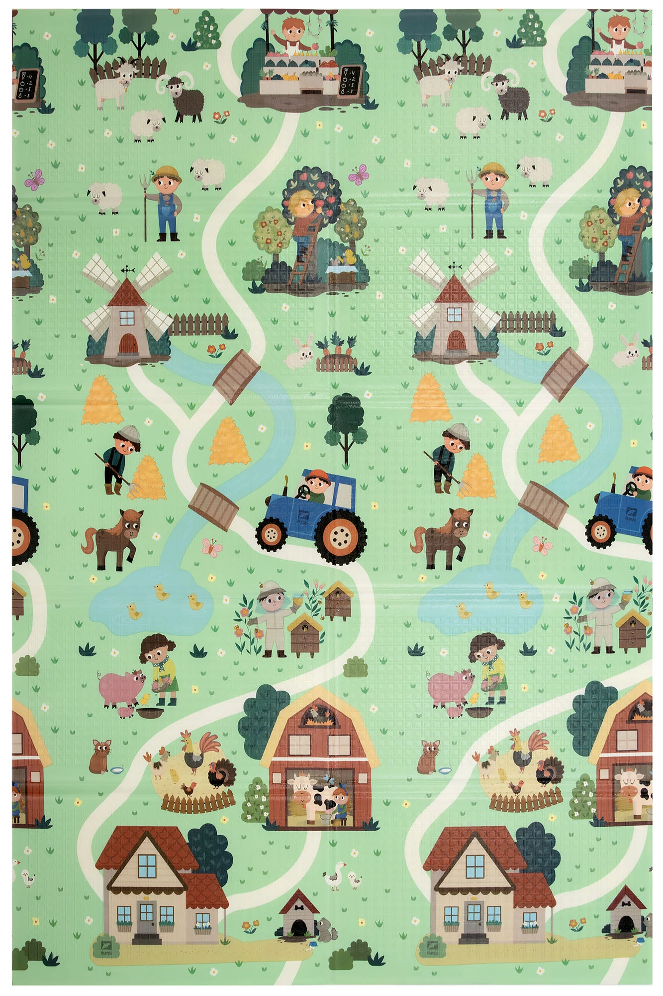 Obojstranný dizajn podporuje učenie a kreativitu: jedna strana s farebnou abecedou a zvieratkami rozvíja poznávanie písmen, druhá strana s dedinou, domčekmi a cestami nabáda k fantazijným hrám. Podložka je protišmyková, vodeodolná a hygienická – stačí ju utrieť vlhkou handričkou. Vďaka skladacej konštrukcii ju rýchlo zložíte, ľahko uložíte a pomocou priloženého vrecka s uškom pohodlne prenesiete.