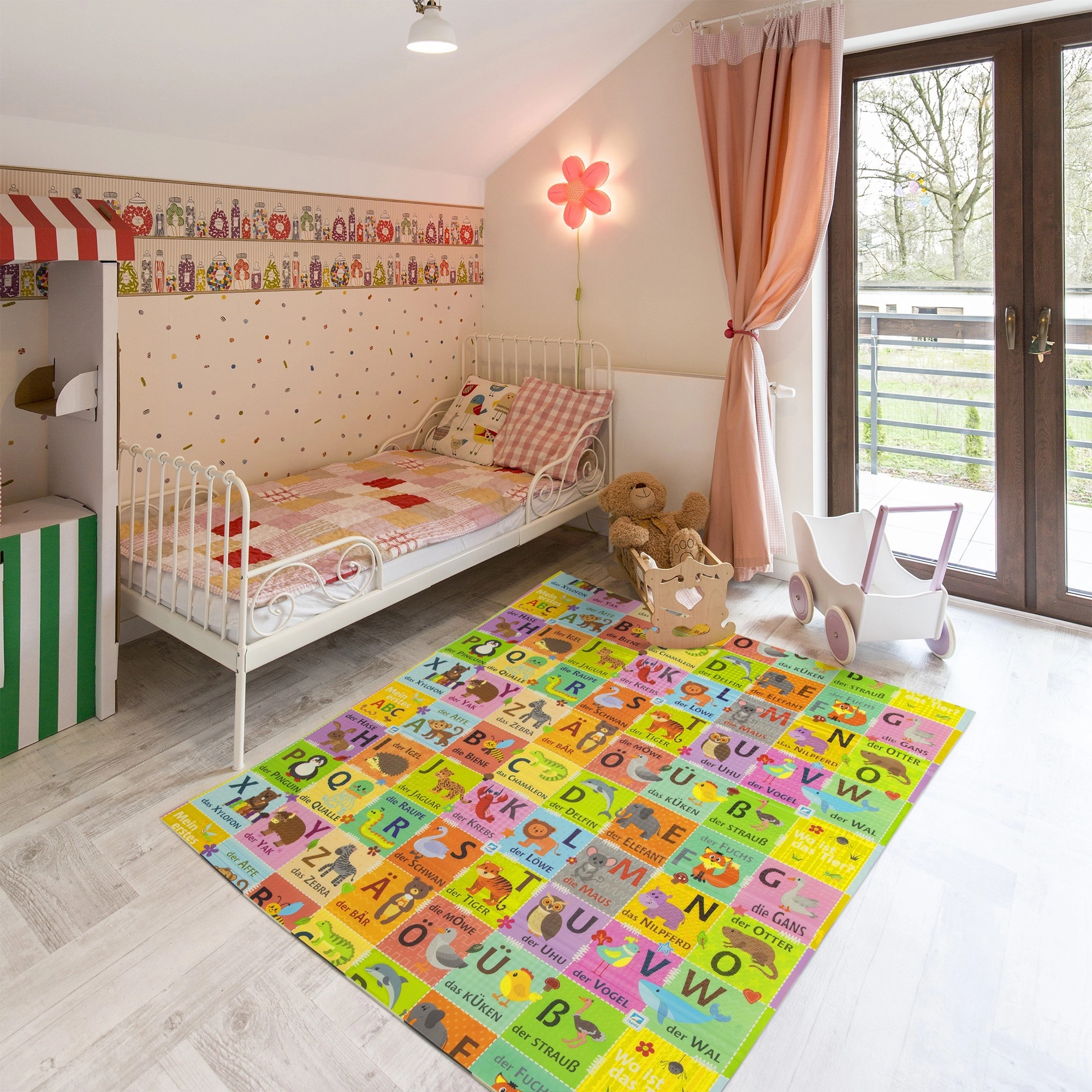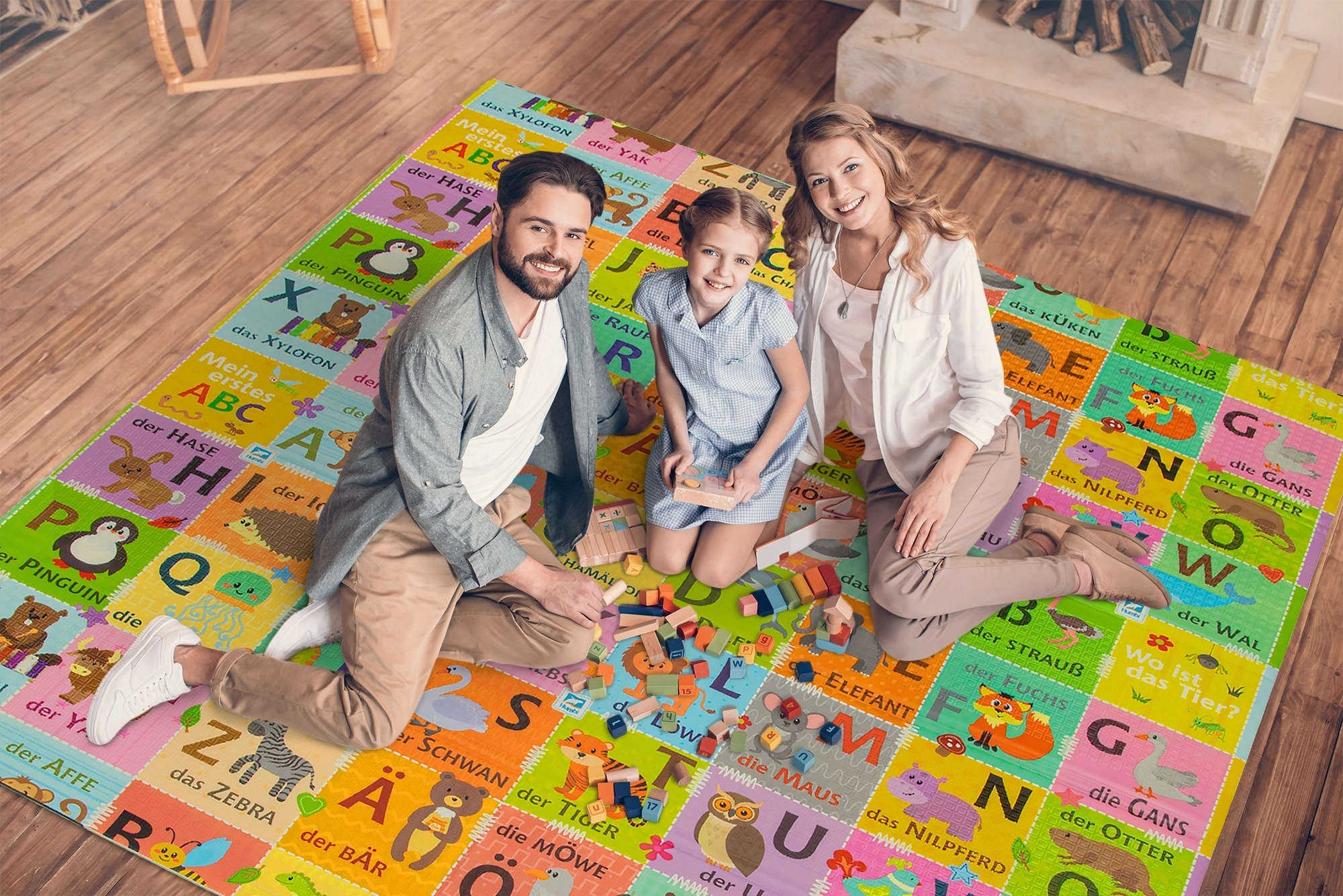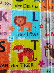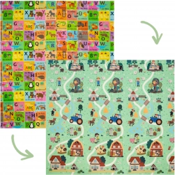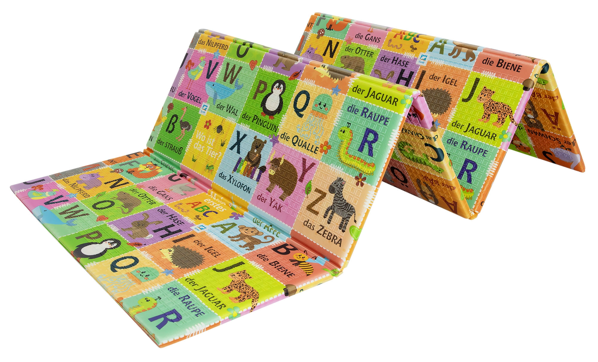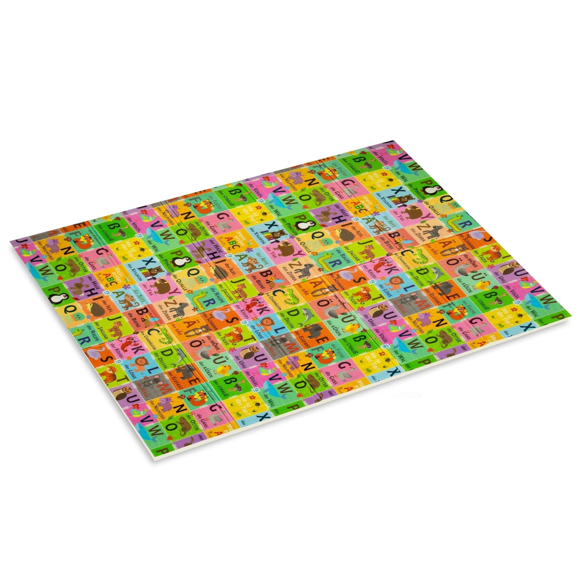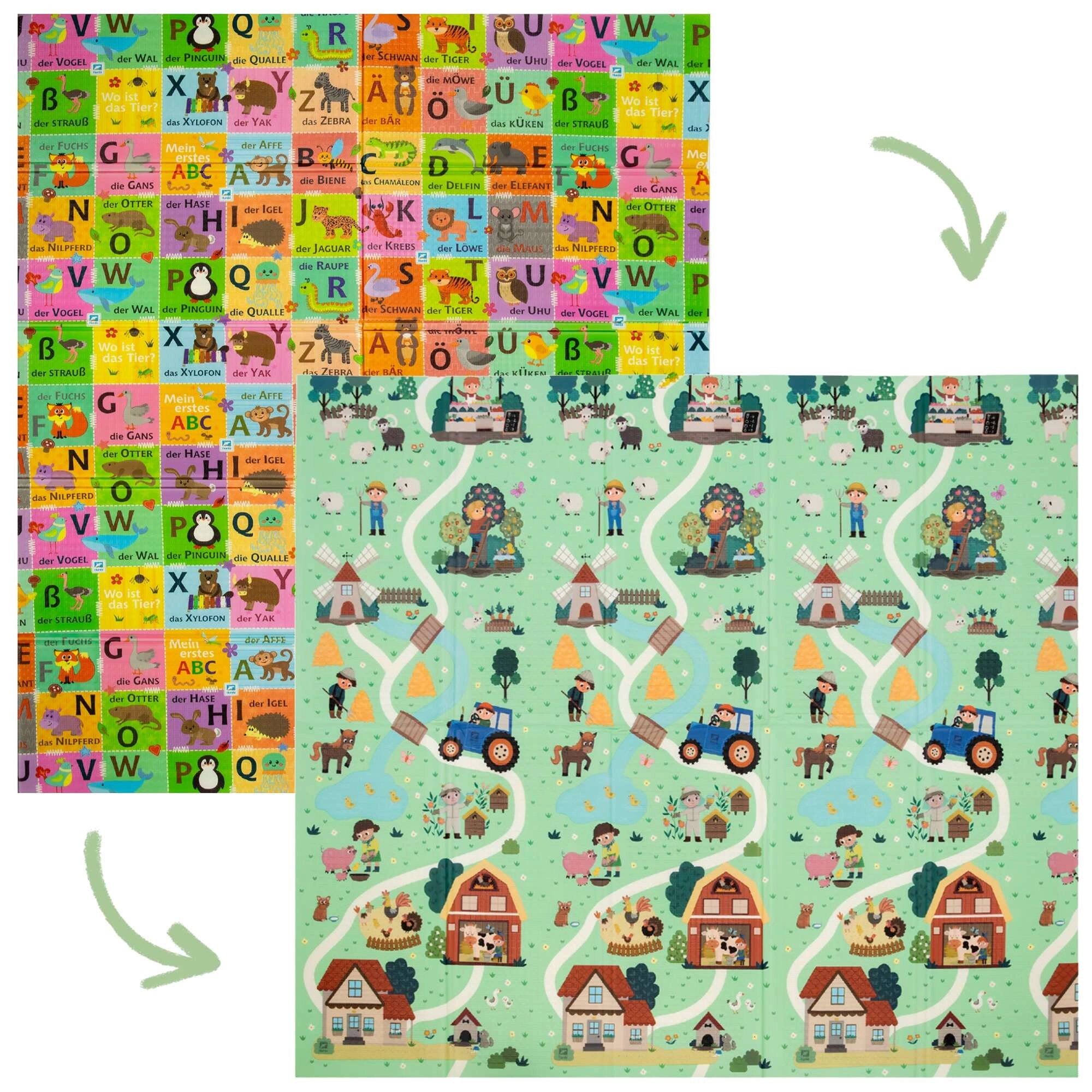Dve strany s edukatívnou grafikou podporujú skoré učenie: jedna zobrazuje nemeckú abecedu so zvieratkami, druhá scenériu zo života na vidieku. Vďaka protišmykovému jemne reliéfnemu povrchu je bezpečná na lezenie a chôdzu a zároveň stimuluje zmyslový rozvoj.