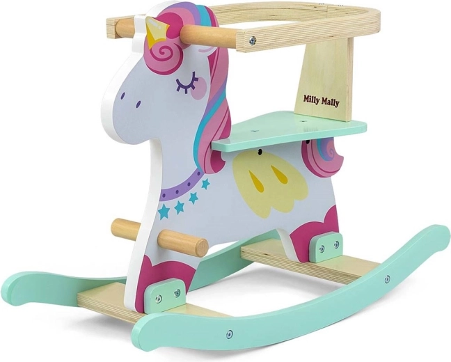 Drevený hojdací koník v tvare jednorožca Lucky poteší každého malého jazdca. Precízne spracovanie z MDF a preglejky, profilované lyžiny pre plynulé hojdanie a praktické opierky na nohy zabezpečujú bezpečný a pohodlný pohyb. Pastelové farby nanesené netoxickými farbami a hravé detaily krásne doplnia detskú izbičku.