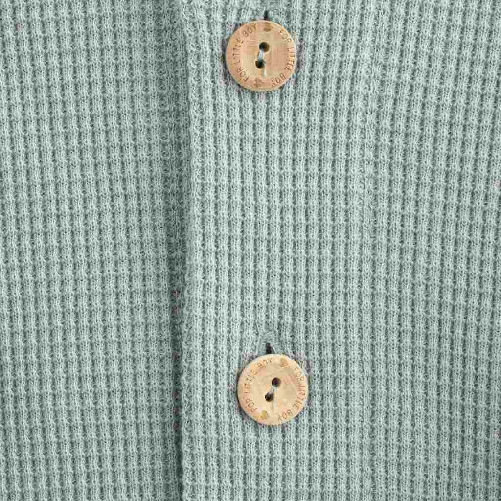 Elegantný detský kabátik/svetřík New Baby Laura v sivej farbe pre bábätká vo veľkosti 62 (3–6 mesiacov). Má praktické zapínanie na gombíky, krásny golierik a drevené gombíky pre elegantný vzhľad. Je vyrobený zo 100 % bavlny, takže je mäkký, priedušný a vhodný na celoročné nosenie na každý deň aj na zvláštne príležitosti.