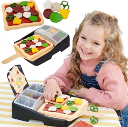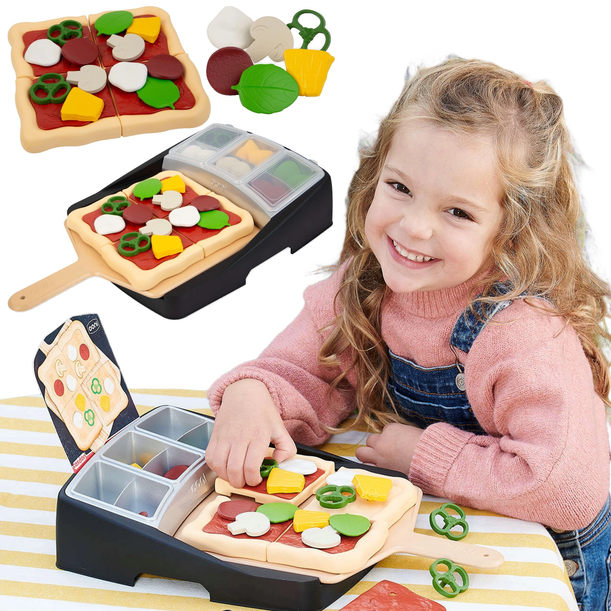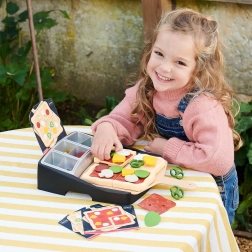 Táto moderná detská pizza sada prináša realistickú prípravu pizze krok za krokom. Vďaka prehľadným priehradkám na suroviny si deti ľahko vyberú, čo na pizzu patrí, a podľa priložených receptov alebo vlastnej fantázie zostavia dokonalú kombináciu. Odnímateľné dieliky sa ľahko upevnia do korpusu a zase zložia, takže sa dá hrať stále dookola.