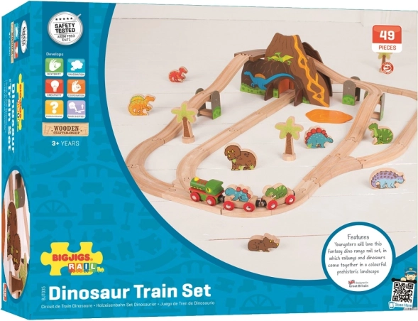 Objavte farebný praveký svet s touto drevenou dinosaurou vláčkodráhou od BIGJIGS RAIL. Sada s 49 dielikmi ponúka dinosauří vlak, sopku s tunelom a pestré figúrky dinosaurov. Kompatibilita s ďalšími drevenými koľajami, kvalitné materiály a bezpečné prevedenie podporujú predstavivosť, jemnú motoriku a koordináciu detí od 3 rokov.