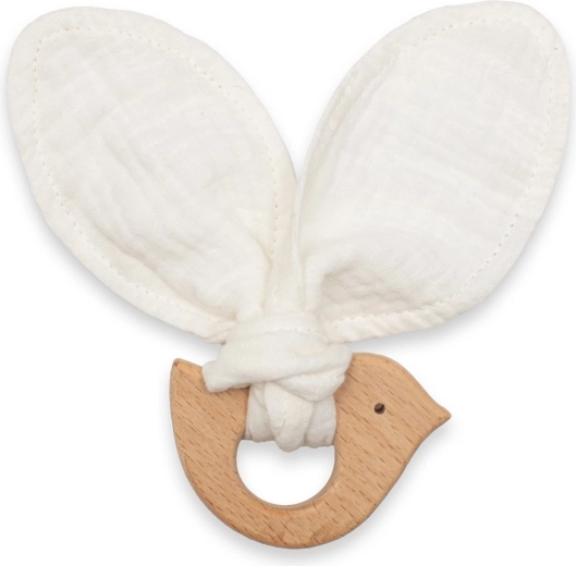 Detské hryzadlo NEW BABY Bird white spája prírodné bukové drevo a jemnú mušelínovú tkaninu zo 100% organickej bavlny. Tvrdšia drevená časť pomáha masírovať ďasná a uľaviť od napätia, zatiaľ čo mäkký mušelín poskytuje hebký dotyk a možnosť jemného utretia slín.