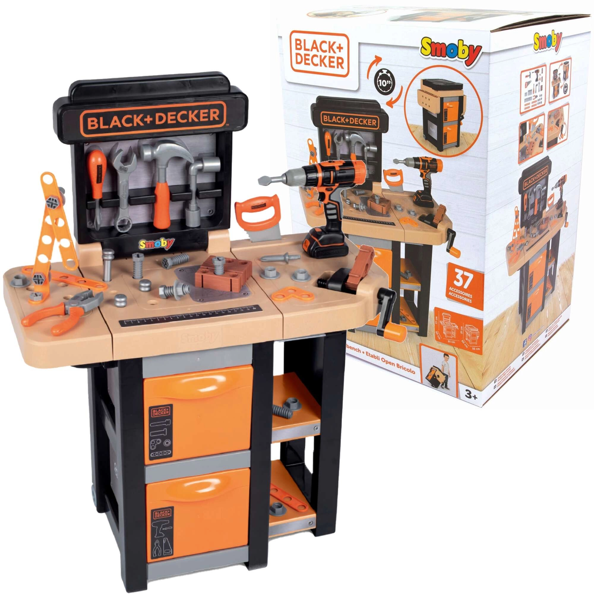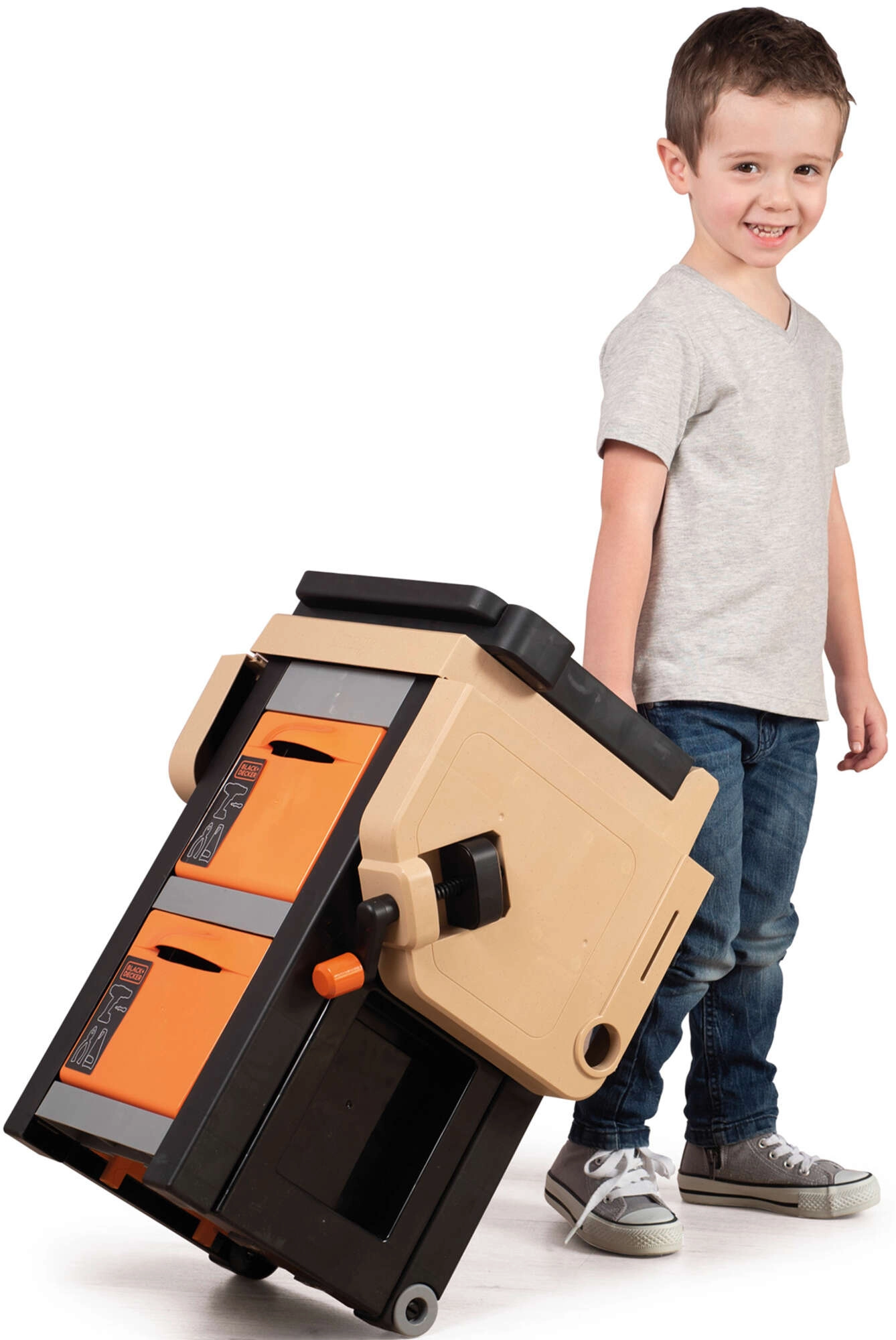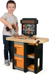 Detský pracovný ponk Smoby BLACK+DECKER Bricolo s celkovo 37 doplnkami poteší všetkých malých kutilov. Stabilný pracovný stôl so zásuvkami a držiakmi náradia obsahuje verné repliky nástrojov BLACK+DECKER – mechanickú vŕtačku, kladivo, pílku, skrutkovač, kľúč, kliešte a zverák. Bezpečné prevedenie bez ostrých hrán rozvíja jemnú motoriku, kreativitu a hru na povolania.