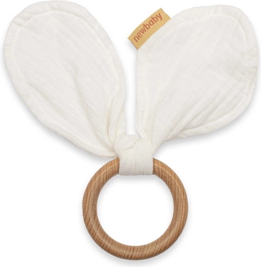 Hryzátko New Baby Ears v bielej farbe je navrhnuté pre pohodlie a upokojenie ďasien pri raste prvých zúbkov. Bukový drevený krúžok je hladký a pevný, zatiaľ čo mäkký mušelín prináša príjemný dotyk a možnosť jemného utretia slín či hrania.