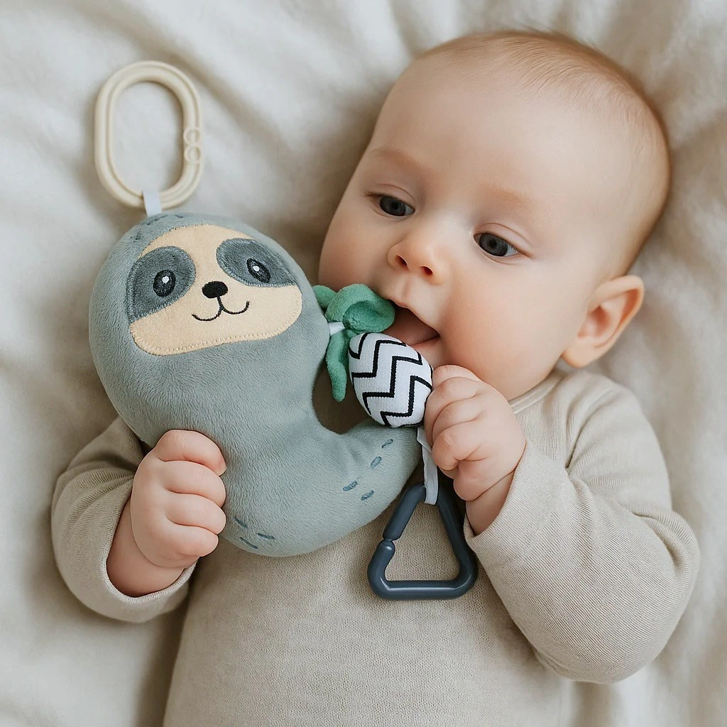 Integrované hrkálky rozvíjajú sluchové vnímanie a podporujú interakciu. Hračka je vyrobená z kvalitných a bezpečných materiálov, vhodných pre batoľatá, a ľahko sa čistí. Perfektná ako doplnok ku kočíku, autosedačke alebo do postieľky.