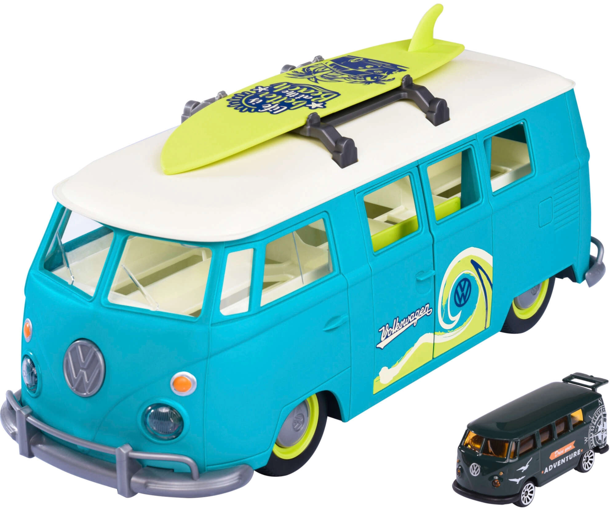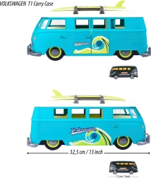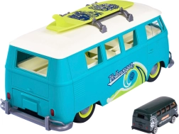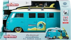 Veľký interaktívny Volkswagen T1 od značky MAJORETTE nadchne precíznym spracovaním a autentickými detailmi legendárneho kempera. Nosič vo forme dodávky v modrozelenom vyhotovení s krémovými prvkami sa otvára do praktického herného kufríka s parkovacími miestami pre priložené autíčko. Predné tlačidlo v tvare loga VW aktivuje jasné svetlá.