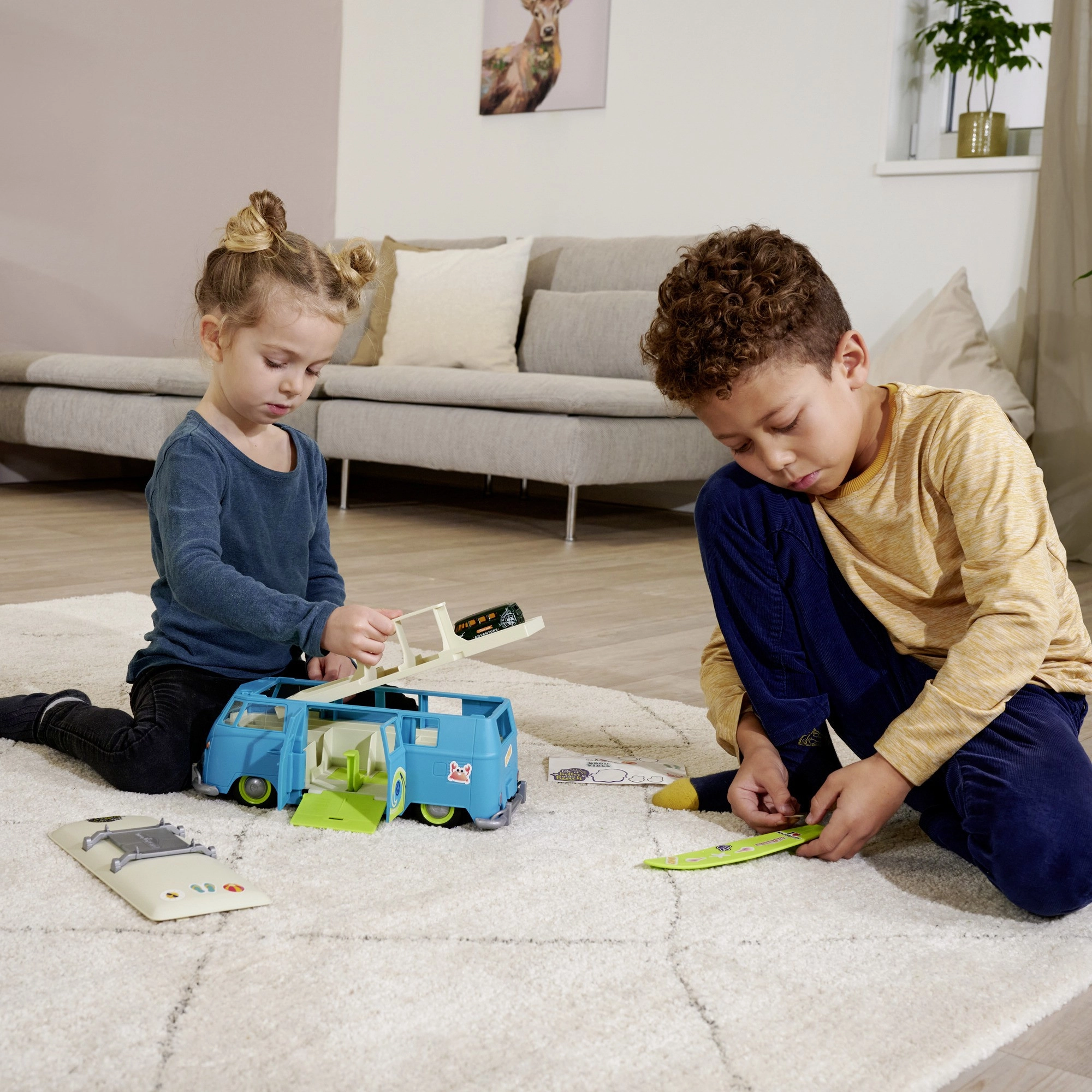 Strecha je odnímateľná, na nosiči nájdete odpojiteľnú surfovaciu dosku a zadná časť má výklopnú klapku s „motorovým“ priestorom. Odolné plastové vyhotovenie je vhodné na každodenné hranie a rozvíja jemnú motoriku aj fantáziu detí od 3 rokov.