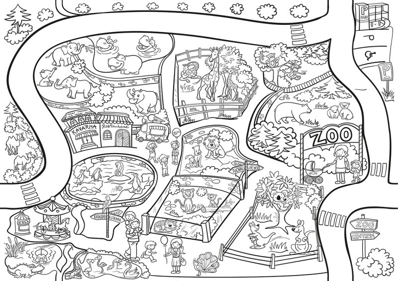 Táto veľkoformátová omaľovánka Zoo je ideálna pre deti aj dospelých, ktorí milujú kreatívne vyfarbovanie. Vďaka rozmeru 64 × 90 cm ponúka veľa priestoru pre fantáziu a detailné vyfarbovanie zvierat a prostredia zoo.