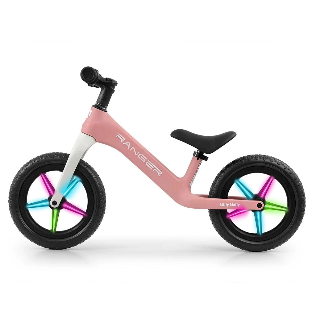 Ľahké odrážadlo MILLY MALLY Ranger Flash v ružovej farbe pomáha deťom rozvíjať rovnováhu a koordináciu pred prechodom na šliapacie bicykel. Ponúka kompozitný rám, bezúdržbové 12″ EVA kolesá a nastaviteľnú výšku sedla pre pohodlie a rast dieťaťa. Ložiskové riadidlá a kolesá, mäkké protišmykové rukoväte a LED osvetlenie lúčov ráfikov zvyšujú bezpečnosť aj zábavu pri jazde.